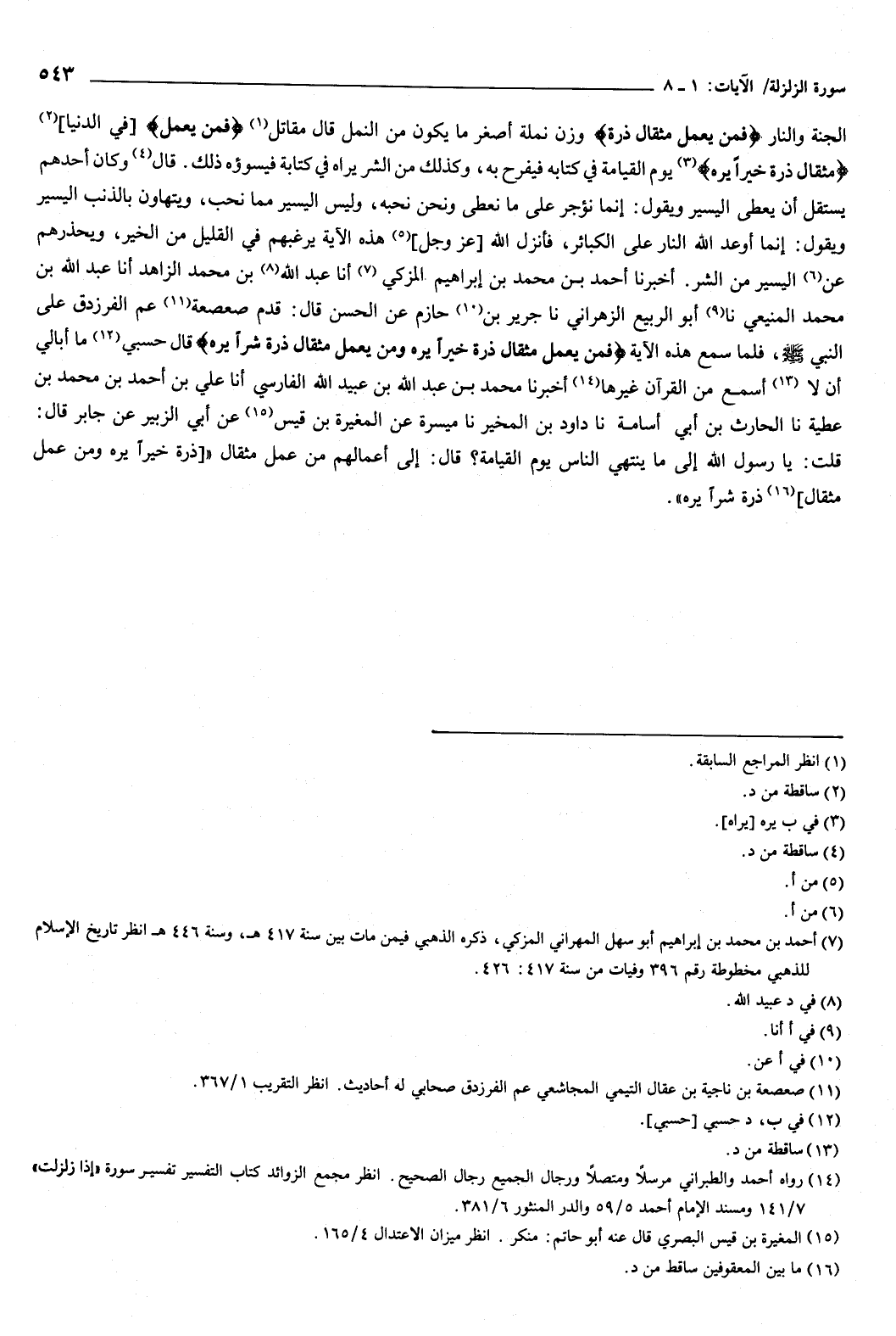 1424 - أَخْبَرَنَا أَحْمَدُ بْنُ مُحَمَّدِ بْنِ إِبْرَاهِيمَ الْمُزَكِّي، أنا عَبْدُ اللَّهِ بْنُ مُحَمَّدٍ الزَّاهِدُ، أنا عَبْدُ اللَّهِ بْنُ مُحَمَّدٍ الْمَنِيعِيُّ، نا أَبُو الرَّبِيعِ الزَّهْرَانِيُّ، نا جَرِيرُ بْنُ حَازِمٍ، عَنِ الْحَسَنِ، قَالَ: " قَدِمَ صَعْصَعَةُ عَمُّ الْفَرَزْدَقِ عَلَى النَّبِيِّ صَلَّى اللهُ عَلَيْهِ وَسَلَّمَ، فَلَمَّا سَمِعَ هَذِهِ الآيَةَ {فَمَنْ يَعْمَلْ مِثْقَالَ ذَرَّةٍ خَيْرًا يَرَهُ {7} وَمَنْ يَعْمَلْ مِثْقَالَ ذَرَّةٍ شَرًّا يَرَهُ {8} } [الزلزلة: 7-8] قَالَ: حَسْبِي مَا أُبَالِي أَنْ لا أَسْمَعَ مِنَ الْقُرْآنِ غَيْرَهَا ".