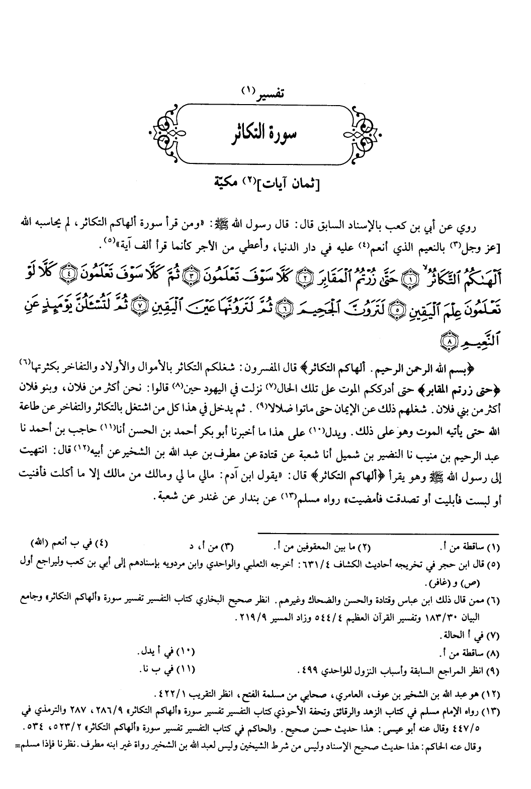 بسم الله الرحمن الرحيم {أَلْهَاكُمُ التَّكَاثُرُ {1} حَتَّى زُرْتُمُ الْمَقَابِرَ {2} كَلَّا سَوْفَ تَعْلَمُونَ {3} ثُمَّ كَلَّا سَوْفَ تَعْلَمُونَ {4} كَلَّا لَوْ تَعْلَمُونَ عِلْمَ الْيَقِينِ {5} لَتَرَوُنَّ الْجَحِيمَ {6} ثُمَّ لَتَرَوُنَّهَا عَيْنَ الْيَقِينِ {7} ثُمَّ لَتُسْأَلُنَّ يَوْمَئِذٍ عَنِ النَّعِيمِ {8} } [التكاثر: 1-8] .