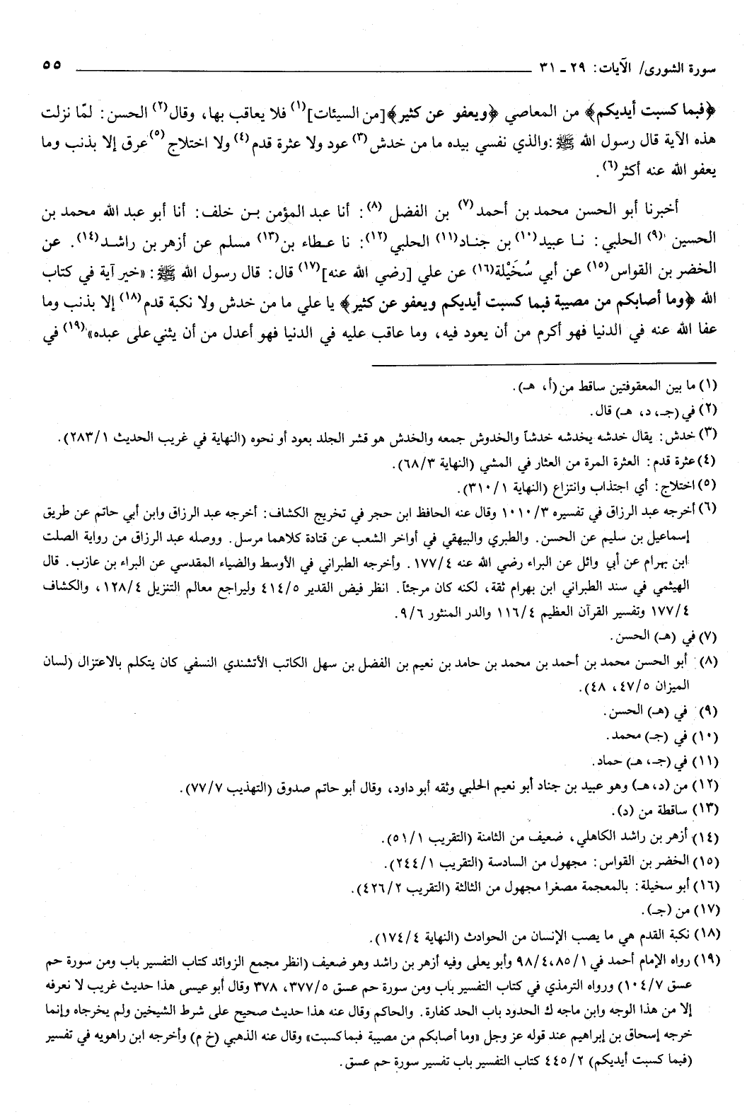 {فَبِمَا كَسَبَتْ أَيْدِيكُمْ} [الشورى: 30] من المعاصي، {وَيَعْفُو عَنْ كَثِيرٍ} [الشورى: 30] من السيئات، فلا يعاقب بها، وقال الحسن: لما نزلت هذه الآية، قال رسول الله صَلَّى اللهُ عَلَيْهِ وَسَلَّمَ: «والذي نفسي بيده، ما من خدش عود، ولا عثرة قدم، ولا اختلاج عرق، إلا بذنب، وما يعفو الله عنه أكثر» .