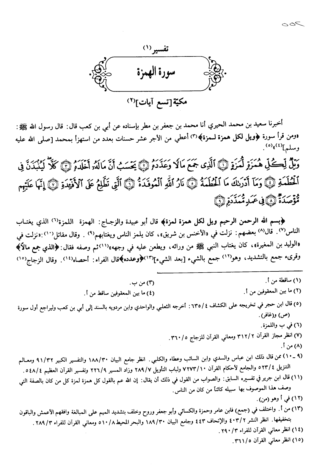 بِسْمِ اللَّهِ الرَّحْمَنِ الرَّحِيمِ {وَيْلٌ لِكُلِّ هُمَزَةٍ لُمَزَةٍ {1} الَّذِي جَمَعَ مَالا وَعَدَّدَهُ {2} يَحْسَبُ أَنَّ مَالَهُ أَخْلَدَهُ {3} كَلَّا لَيُنْبَذَنَّ فِي الْحُطَمَةِ {4} وَمَا أَدْرَاكَ مَا الْحُطَمَةُ {5} نَارُ اللَّهِ الْمُوقَدَةُ {6} الَّتِي تَطَّلِعُ عَلَى الأَفْئِدَةِ {7} إِنَّهَا عَلَيْهِمْ مُؤْصَدَةٌ {8} فِي عَمَدٍ مُمَدَّدَةٍ {9} } [الهمزة: 1-9] .