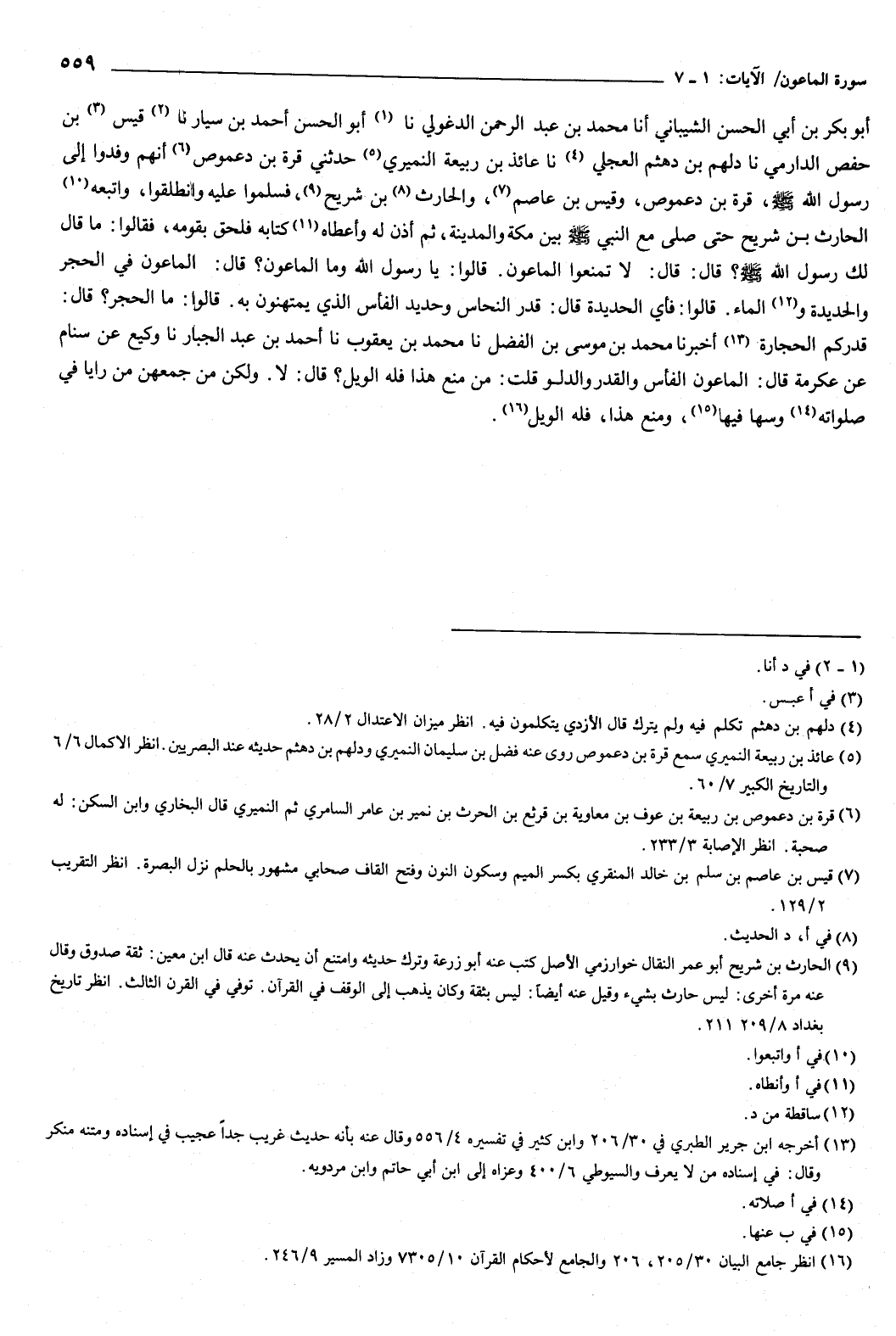 أَبُو بَكْرِ بْنُ أَبِي الْحَسَنِ الشَّيْبَانِيُّ، أنا مُحَمَّدُ بْنُ عَبْدِ الرَّحْمَنِ الدَّغُولِيُّ، نا أَبُو الْحَسَنِ أَحْمَدُ بْنُ سَيَّارٍ، نا قَيْسُ بْنُ حَفْصٍ الدَّارِمِيُّ، نا دَلْهَمُ بْنُ دَهْثَمٍ الْعِجْلِيُّ، نا عَائِذُ بْنُ رَبِيعَةَ النُّمَيْرِيُّ، حَدَّثَنِي قُرَّةُ بْنُ دَعْمُوصٍ، " أَنَّهُمْ وَفَدُوا إِلَى رَسُولِ اللَّهِ صَلَّى اللهُ عَلَيْهِ وَسَلَّمَ، قُرَّةُ بْنُ دَعْمُوصٍ، وَقَيْسُ بْنُ عَاصِمٍ، وَالْحَارِثُ بْنُ شُرَيْحٍ، فَسَلَّمُوا عَلَيْهِ وَانْطَلَقُوا وَاتَّبَعَهُ الْحَارِثُ بْنُ شُرَيْحٍ حَتَّى صَلَّى مَعَ النَّبِيِّ صَلَّى اللهُ عَلَيْهِ وَسَلَّمَ بَيْنَ مَكَّةَ وَالْمَدِينَةِ، ثُمَّ أَذِنَ لَهُ وَأَعْطَاهُ كِتَابَهُ، فَلَحِقَ بِقَوْمِهِ، فَقَالُوا: مَا قَالَ لَكَ رَسُولُ اللَّهِ صَلَّى اللهُ عَلَيْهِ وَسَلَّمَ؟ قَالَ: قَالَ: لا تَمْنَعُوا الْمَاعُونَ، قَالُوا: يَا رَسُولَ اللَّهِ وَمَا الْمَاعُونُ؟ قَالَ: الْمَاعُونُ فِي الْحَجَرِ وَالْحَدِيدَةِ وَالْمَاءِ، قَالُوا: فَأَيُّ الْحَدِيدَةِ، قَالَ: قِدْرُ النُّحَاسِ وَحَدِيدُ الْفَأْسِ الَّذِي يَمْتَهِنُونَ بِهِ، قَالُوا: مَا الْحَجَرُ؟ قَالَ: قُدُورُكُمُ الْحِجَارَةُ ".