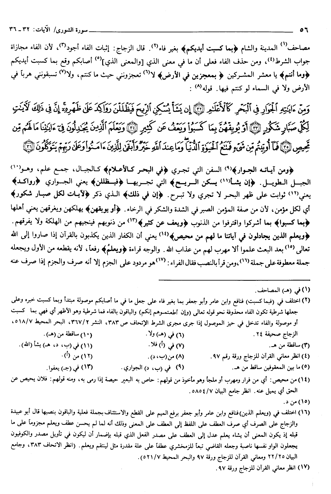 قوله: {وَمِنْ آيَاتِهِ الْجَوَارِ فِي الْبَحْرِ كَالأَعْلامِ {32} إِنْ يَشَأْ يُسْكِنِ الرِّيحَ فَيَظْلَلْنَ رَوَاكِدَ عَلَى ظَهْرِهِ إِنَّ فِي ذَلِكَ لآيَاتٍ لِكُلِّ صَبَّارٍ شَكُورٍ {33} أَوْ يُوبِقْهُنَّ بِمَا كَسَبُوا وَيَعْفُ عَنْ كَثِيرٍ {34} وَيَعْلَمَ الَّذِينَ يُجَادِلُونَ فِي آيَاتِنَا مَا لَهُمْ مِنْ مَحِيصٍ {35} فَمَا أُوتِيتُمْ مِنْ شَيْءٍ فَمَتَاعُ الْحَيَاةِ الدُّنْيَا وَمَا عِنْدَ اللَّهِ خَيْرٌ وَأَبْقَى لِلَّذِينَ آمَنُوا وَعَلَى رَبِّهِمْ يَتَوَكَّلُونَ {36} } [الشورى: 32-36] .