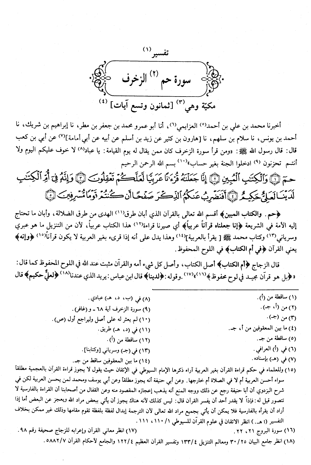بسم الله الرحمن الرحيم {حم {1} وَالْكِتَابِ الْمُبِينِ {2} إِنَّا جَعَلْنَاهُ قُرْءَانًا عَرَبِيًّا لَعَلَّكُمْ تَعْقِلُونَ {3} وَإِنَّهُ فِي أُمِّ الْكِتَابِ لَدَيْنَا لَعَلِيٌّ حَكِيمٌ {4} أَفَنَضْرِبُ عَنْكُمُ الذِّكْرَ صَفْحًا أَنْ كُنْتُمْ قَوْمًا مُسْرِفِينَ {5} } [الزخرف: 1-5] .