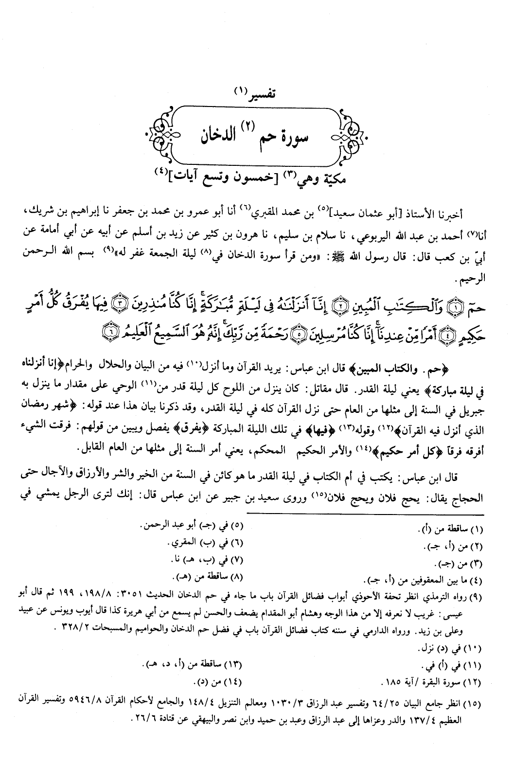 بسم الله الرحمن الرحيم {حم {1} وَالْكِتَابِ الْمُبِينِ {2} إِنَّا أَنْزَلْنَاهُ فِي لَيْلَةٍ مُبَارَكَةٍ إِنَّا كُنَّا مُنْذِرِينَ {3} فِيهَا يُفْرَقُ كُلُّ أَمْرٍ حَكِيمٍ {4} أَمْرًا مِنْ عِنْدِنَا إِنَّا كُنَّا مُرْسِلِينَ {5} رَحْمَةً مِنْ رَبِّكَ إِنَّهُ هُوَ السَّمِيعُ الْعَلِيمُ {6} } [الدخان: 1-6] {حم {1} وَالْكِتَابِ الْمُبِينِ {2} } [الدخان: 1-2] قال ابن عباس: يريد القرآن، وما أنزل فيه من البيان، والحلال والحرام.