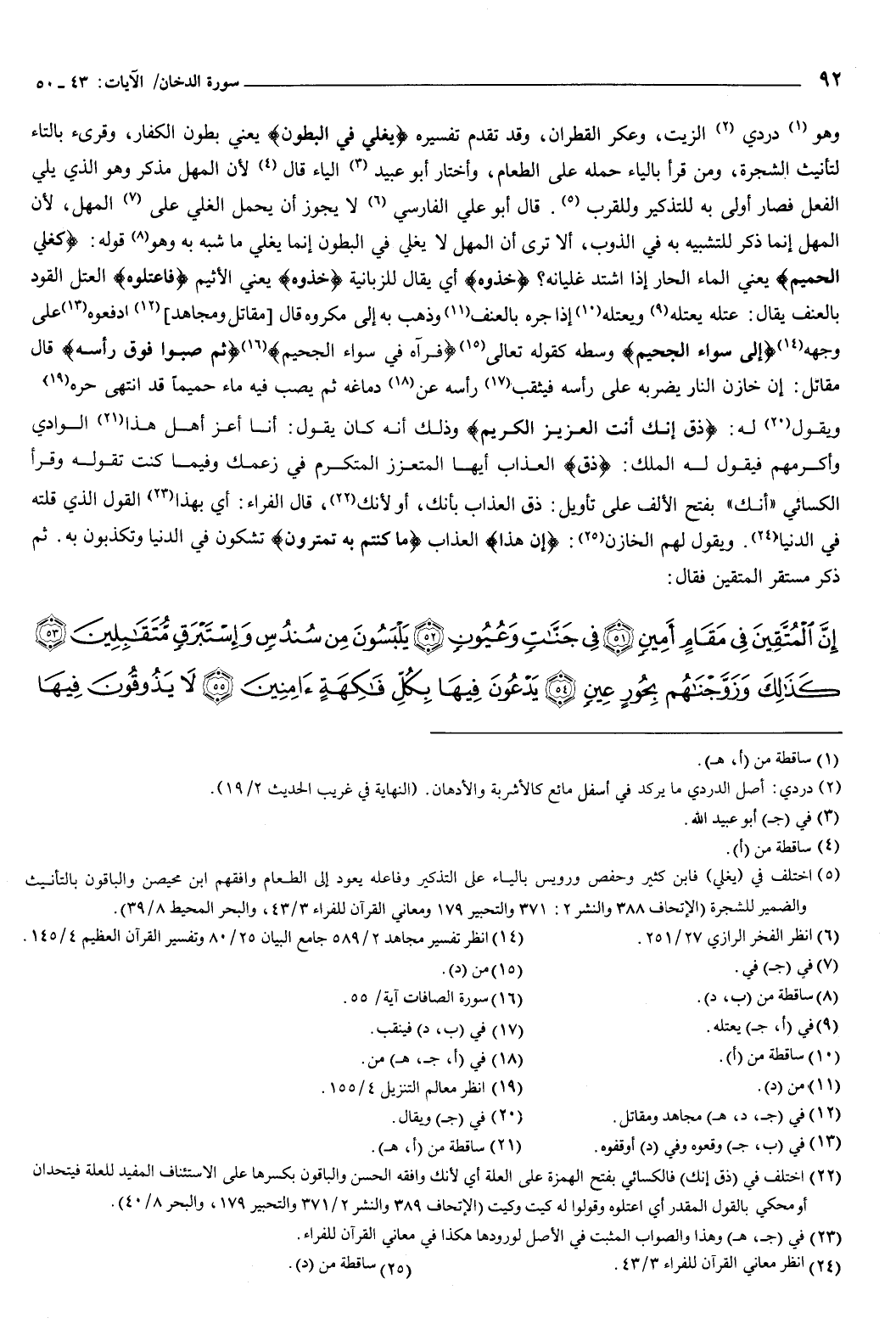 وهو دردي الزيت، وعكر القطران، وقد تقدم تفسيره، {يَغْلِي فِي الْبُطُونِ} [الدخان: 45] يعني: بطون الكفار، وقرئ بالتاء لتأنيث الشجرة، ومن قرأ بالياء حمله على الطعام، واختار أبو عبيد الياء، قال: لأن المهل مذكر، وهو الذي يلي الفعل، فصار أولى به، للتذكير وللقرب.