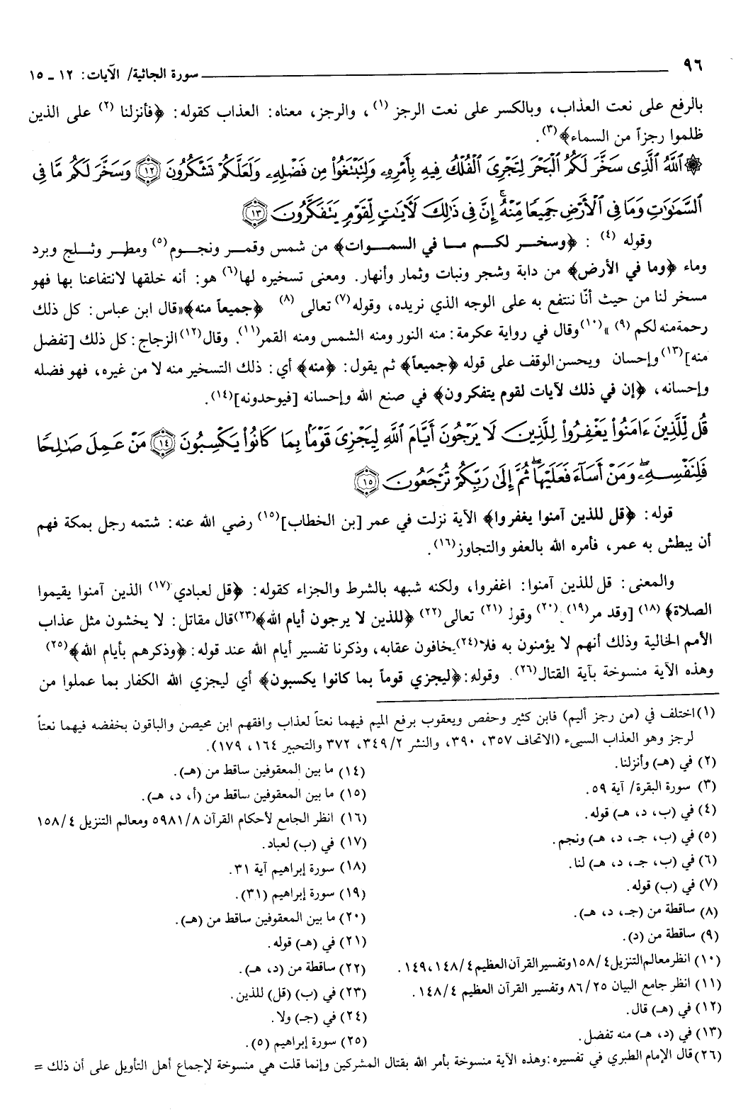 {قُلْ لِلَّذِينَ آمَنُوا يَغْفِرُوا لِلَّذِينَ لا يَرْجُونَ أَيَّامَ اللَّهِ لِيَجْزِيَ قَوْمًا بِمَا كَانُوا يَكْسِبُونَ {14} مَنْ عَمِلَ صَالِحًا فَلِنَفْسِهِ وَمَنْ أَسَاءَ فَعَلَيْهَا ثُمَّ إِلَى رَبِّكُمْ تُرْجَعُونَ {15} } [الجاثية: 14-15] قوله: {قُلْ لِلَّذِينَ آمَنُوا يَغْفِرُوا} [الجاثية: 14] الآية نزلت في عمر بن الخطاب، رضي الله عنه: شتمه رجل بمكة، فهم أن يبطش به عمر، فأمره الله بالعفو، والتجاوز.