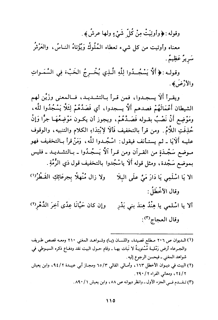 بموضع سَجْدة، ومثل قوله أَلاَ ياسْجُدوا بالتخفيف قول ذي الرُّمَّةِ.