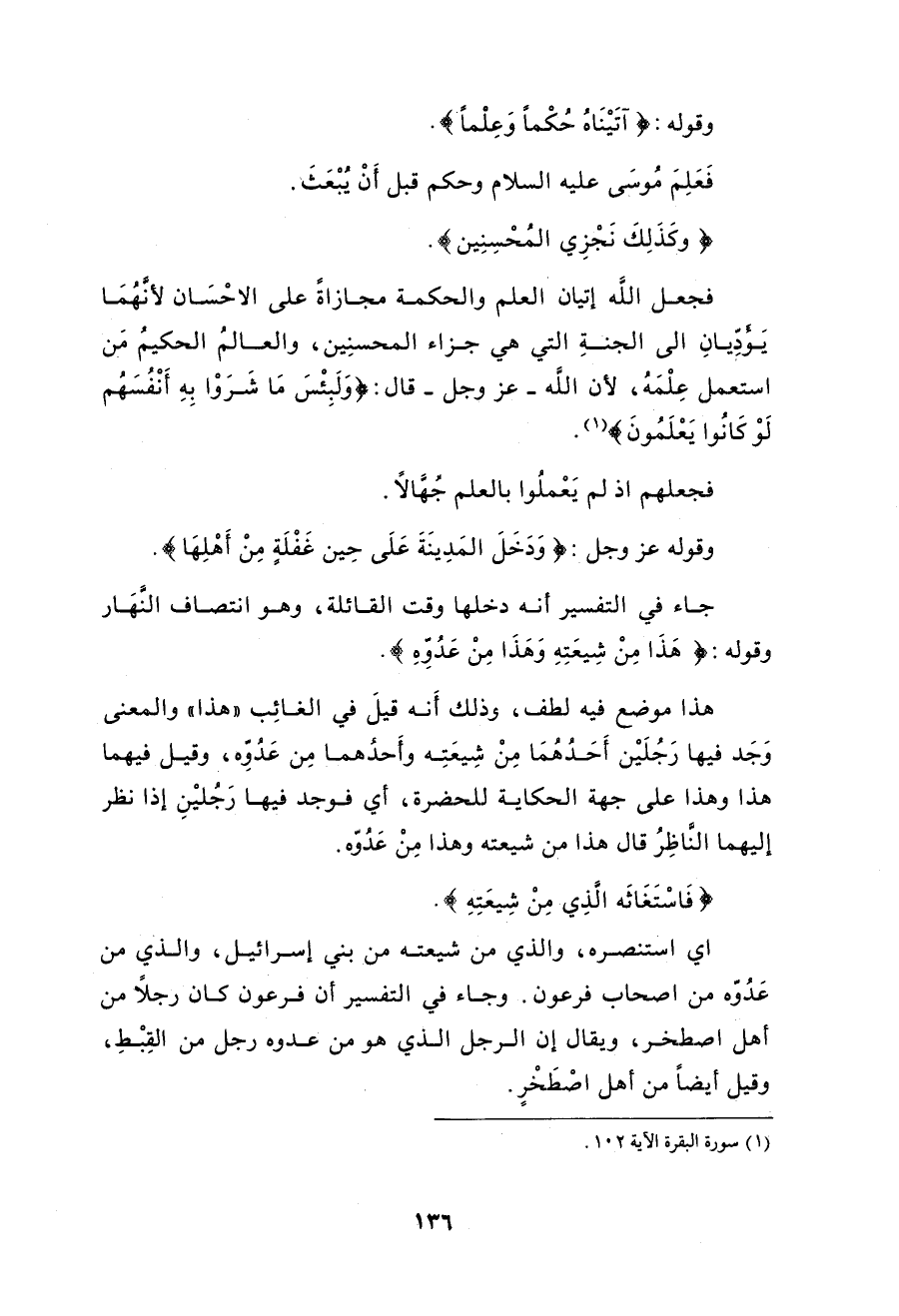وقوله عزَّ وجلَّ: (وَدَخَلَ الْمَدِينَةَ عَلَى حِينِ غَفْلَةٍ مِنْ أَهْلِهَا فَوَجَدَ فِيهَا رَجُلَيْنِ يَقْتَتِلَانِ هَذَا مِنْ شِيعَتِهِ وَهَذَا مِنْ عَدُوِّهِ فَاسْتَغَاثَهُ الَّذِي مِنْ شِيعَتِهِ عَلَى الَّذِي مِنْ عَدُوِّهِ فَوَكَزَهُ مُوسَى فَقَضَى عَلَيْهِ قَالَ هَذَا مِنْ عَمَلِ الشَّيْطَانِ إِنَّهُ عَدُوٌّ مُضِلٌّ مُبِينٌ (15)