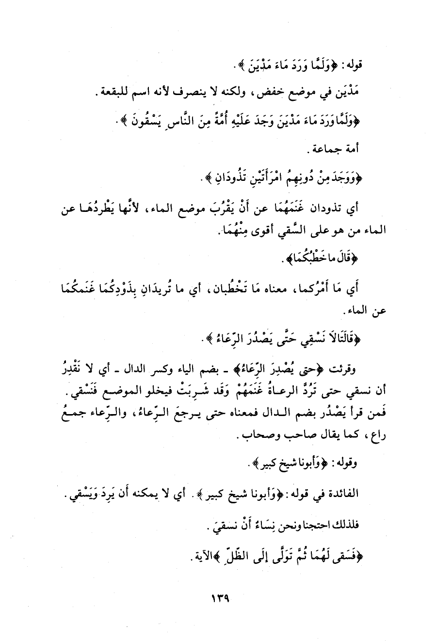 قوله: (وَلَمَّا وَرَدَ مَاءَ مَدْيَنَ وَجَدَ عَلَيْهِ أُمَّةً مِنَ النَّاسِ يَسْقُونَ وَوَجَدَ مِنْ دُونِهِمُ امْرَأَتَيْنِ تَذُودَانِ قَالَ مَا خَطْبُكُمَا قَالَتَا لَا نَسْقِي حَتَّى يُصْدِرَ الرِّعَاءُ وَأَبُونَا شَيْخٌ كَبِيرٌ (23)