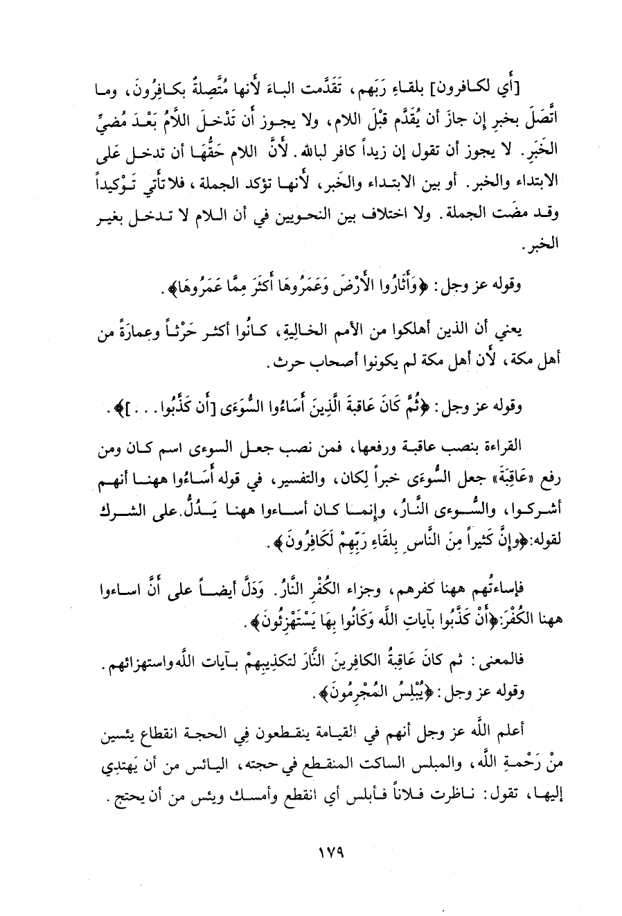 رفع " عَاقِبَةُ " جعل (السُّوأَى) خبراً لِكان، والتفسير، في قوله (أَسَاءُوا) ههنا أنهم أشركوا، و (السُّوأَى) النَّارُ، وإنما كان (أَسَاءُوا) ههنا يَدُل على الشرك