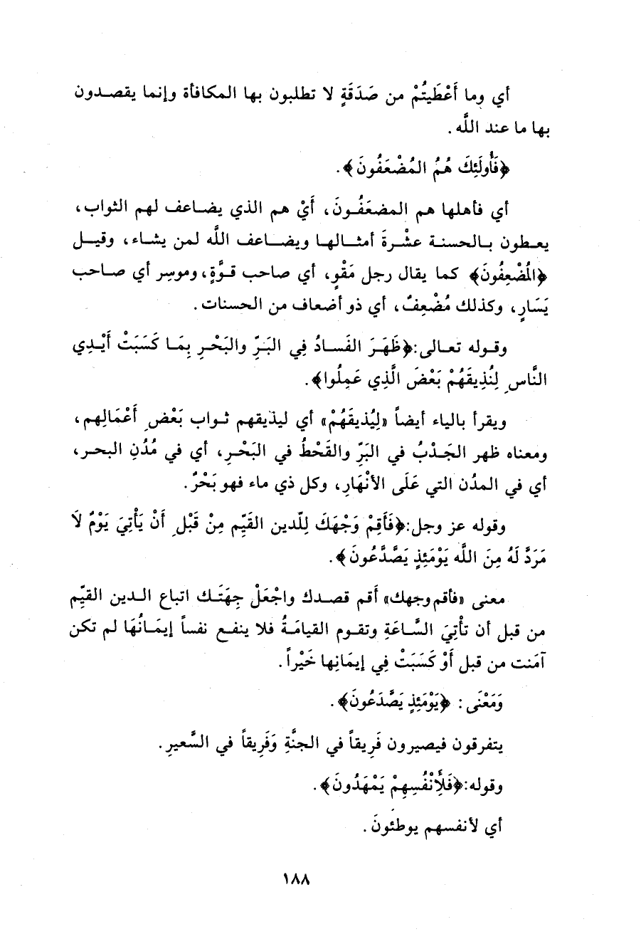 وقوله: «فأولئك هم» قال الزمخشري: «التفاتٌ حسن، كأنه [قال] لملائكتِه: فأولئك الذين يريدون وجهَ اللَّهِ بصدقاتِهم هم المُضْعِفون. والمعنى: هم المُضْعِفُون به؛ لأنه لا بُدَّ مِنْ ضميرٍ يَرْجِعُ إلى ما» انتهى. يعني أنَّ اسم الشرط متى كان غيرَ ظرفٍ وَجَبَ عَوْدُ ضميرٍ من الجواب عليه. وتقدَّم ذلك في البقرة عند قوله: {قُلْ مَن كَانَ عَدُوّاً لِّجِبْرِيلَ} [البقرة: 97] الآية. ثم قال: ووجهٌ آخرُ: وهو أَنْ يكونَ تقديرُه: فَمُؤْتُوْه فأولئك هم المُضْعَفُون. والحَذْفُ لِما في الكلامِ مِن الدليلِ عليه. وهذا أسهلُ مَأْخَذاً، والأولُ أمْلأُ بالفائدة «. اهـ (الدُّرُّ المصُون).