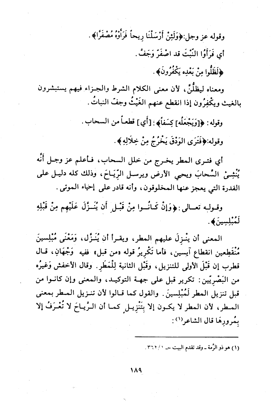 وقال المبردُ:» الثاني السحابُ؛ لأنهم لَمَّا رَأَوْا السحابَ كانوا راجين المطرَ «انتهى. يريد مِنْ قبل رؤيةِ السحاب. ويحتاج أيضاً إلى حَرْفِ عطفٍ ليصِحَّ تعلُّقُ الحرفين ب» مُبْلِسين «. وقال الرمَّاني:» من قبلِ الإِرسال «. والكرماني:» من قَبْلِ الاستبشارِ؛ لأنه قَرَنه بالإِبلاس، ولأنه مَنَّ عليهم بالاستبشار «. ويحتاج قولُهما إلى حرفِ العطفِ لِما تقدَّم، وادِّعاءُ حرفِ العطفِ ليس بالسهلِ؛ فإنَّ فيه خلافاً: بعضُهم يَقيسُه، وبعضُهم لا يقيسه. هذا كلُّهُ في المفردات. أمَّا إذا كان في الجمل فلا خلافَ في اقتياسِه.