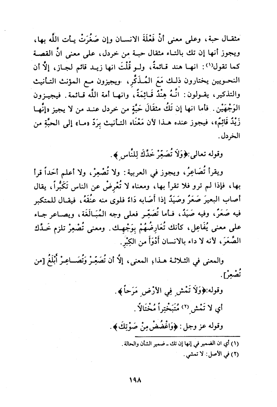 قوله: {وَلاَ تُصَعِّرْ}: قرأ نافعٌ وأبو عمروٍ والأخَوان «تَصاعِرَ» بألفٍ وتخفيفِ العينِ. والباقون دون ألفٍ وتشديد العين، والرسمُ يَحْتمِلُهما؛ فإنَّ الرسمَ بغيرِ ألفٍ. وهما لغتان: لغةُ الحجازِ التخفيفُ، وتميمٌ التثقيلُ. فمِن التثقيلِ قوله:
