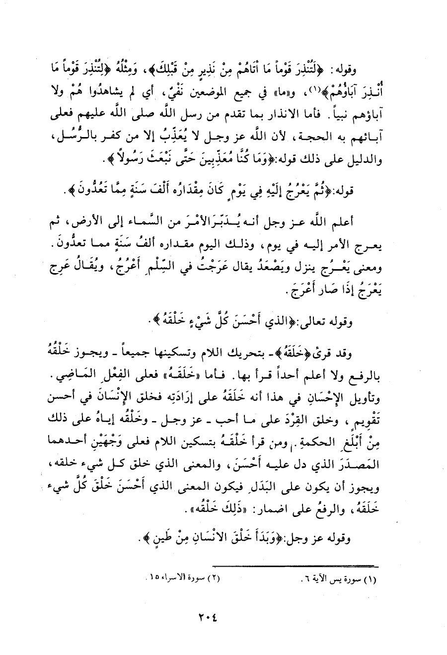 قوله: «خَلَقَه» قرأ ابن كثير وأبو عمرو وابن عامر بسكونِ اللام. والباقون بفتحها. فأمَّا الأُولى ففيها أوجهٌ، أحدُها: أن يكونَ «خَلْقَه» بدلاً مِنْ «كلَّ شيء» بدلَ اشتمالٍ مِنْ «كلَّ شيءٍ»، والضميرُ عائدٌ على كل شيء. وهذا هو المشهورُ المتداوَلُ. الثاني: أنه بدلُ كلٍ مِنْ كل، والضميرُ على هذا عائدٌ على الباري تعالى. ومعنى «أحسن»: /حَسَّن؛ لأنه ما مِنْ شيءٍ خَلَقَه إلاَّ وهو مُرَتَّبٌ على ما تَقْتَضيه الحكمةُ، فالمخلوقاتُ كلُّها حسنةٌ. الثالث: أن يكونَ «كلَّ شيءٍ» مفعولاً أول، و «خَلْقَه» مفعولاً ثانياً على أَنْ يُضَمَّن «أحسَنَ» معنى أَعْطى وأَلْهَمَ. قال مجاهد: «أعطى كلَّ جنسٍ شكله». والمعنى: خَلَقَ كلَّ شيءٍ على شكلِه الذي خصَّه به. الرابع: أن يكون «كلَّ شيء» مفعولاً ثانياً قُدِّم، و «خَلْقَه» مفعولاً أول أُخِّر، على أَنْ يُضَمَّنَ «أَحْسَنَ» معنى أَلْهَمَ وعَرَّف. قال الفراء: «ألهم كلَّ شيءٍ خَلْقَه فيما يحتاجون إليه فيكونُ أَعْلَمهم ذلك». قلت: وأبو البقاء ضَمَّن أحسنَ معنى عَرَّف. وأَعْرَبَ على نحوِ ما تقدَّم، إلاَّ أنه لا بُدَّ أن يُجْعَلَ الضميرُ لله تعالى، ويُجعلَ الخَلْقُ بمعنى المَخْلوق أي: عَرَّف مخلوقاتِه كلَّ شيءٍ يحتاجون إليه، فيَؤول المعنى إلى معنى قولِه: {أعطى كُلَّ شَيءٍ خَلْقَهُ ثُمَّ هدى} [طه: 50].