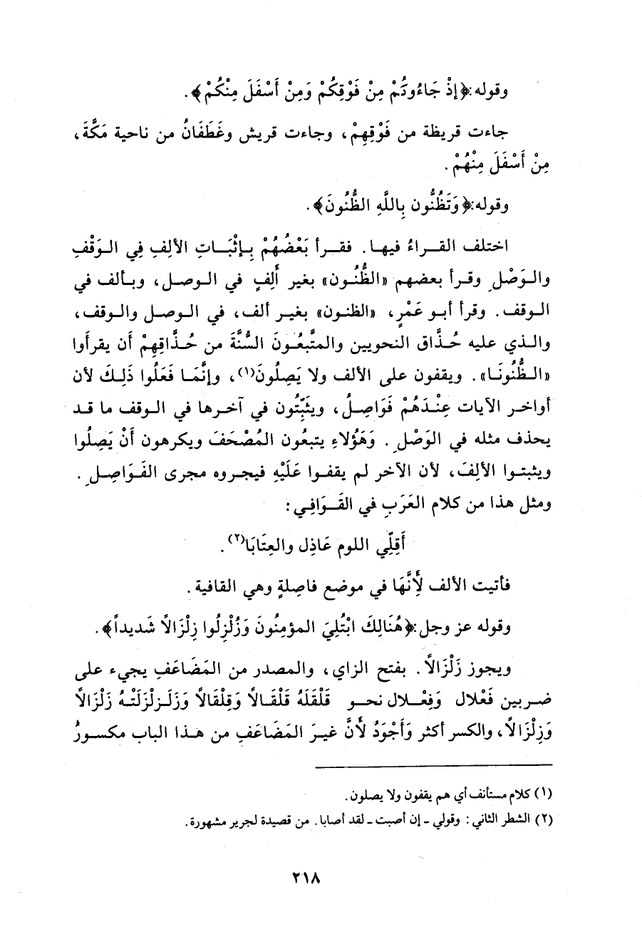 وقوله: «الظنونا» قرأ نافع وابنُ عامر وأبو بكر بإثبات ألفٍ بعد نون «الظُّنونا» ولامِ «الرسول» في قوله: {وَأَطَعْنَا الرسولا} [الأحزاب: 66] ولام «السَّبيل» في قوله: {فَأَضَلُّونَا السبيلا} [الأحزاب: 67] وَصْلاً ووَقْفاً موافقةً للرسمِ؛ لأنهنَّ رُسِمْنَ في المصحف كذلك. وأيضاً فإنَّ هذه الألفَ تُشْبه هاءَ السكتِ لبيانِ الحركة، وهاءُ السكتِ تَثْبُتُ وقفاً، للحاجة إليها. وقد ثَبَتَتْ وصلاً إجراءً للوصل مُجْرى الوقف كما تقدَّم في البقرة والأنعام. فكذلك هذه الألفُ. وقرأ أبو عمروٍ وحمزةُ بحَذْفِها في الحالَيْن؛ لأنها لا أصلَ لها. وقولُهم: «أُجْرِيَتْ الفواصلُ مُجْرى القوافي» غيرُ مُعْتَدٍّ به؛ لأنَّ القوافي يَلزَمُ الوقفُ عليها غالباً، والفواصلُ لا يَلْزَمُ ذلك فيها فلا تُشَبَّهُ بها. والباقون بإثباتِها وَقْفاً وحَذْفِها وَصْلاً إجراءً للفواصلُ مُجْرى القوافي في ثبوتِ ألفِ الإِطلاق كقولِه: