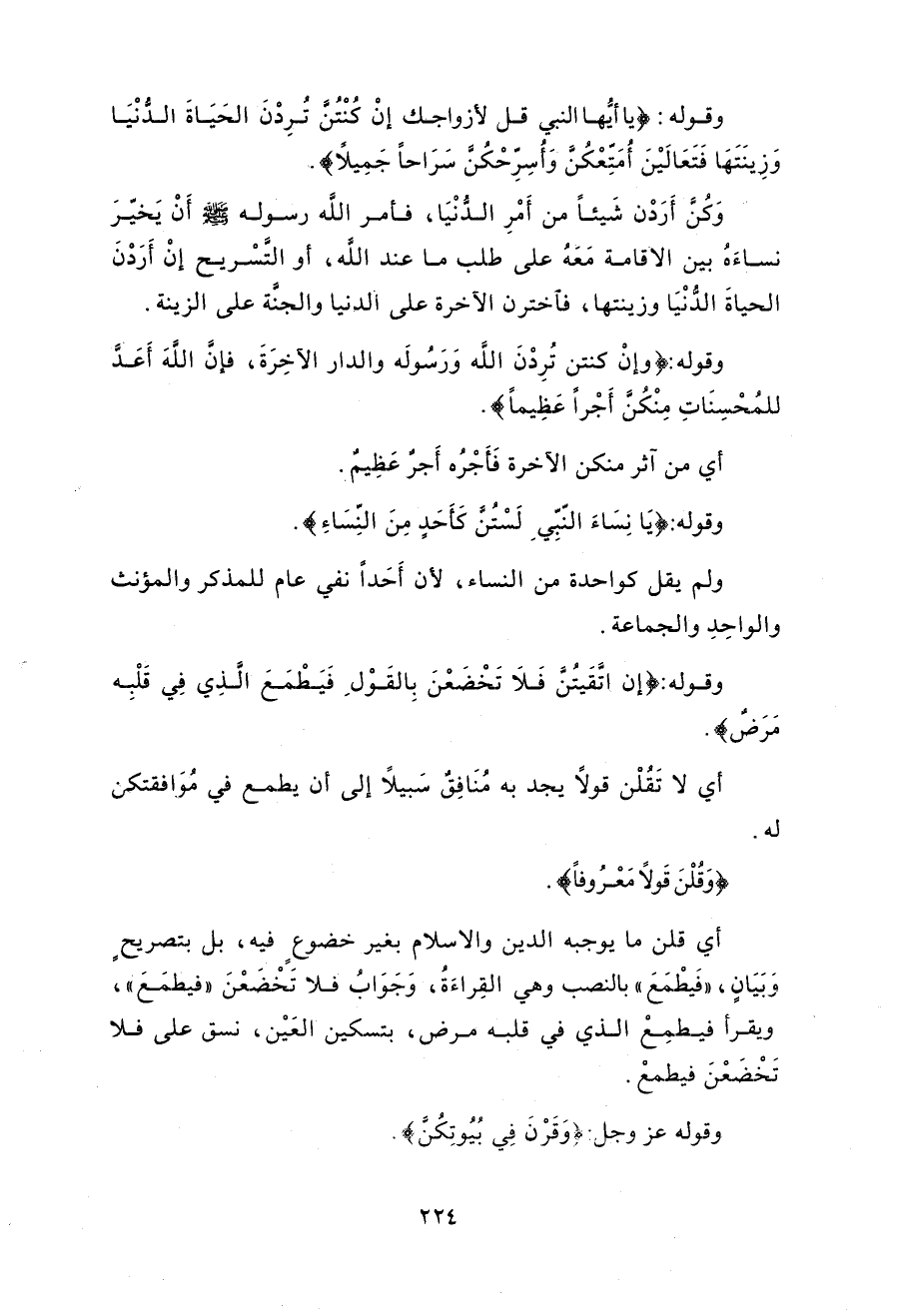 وقوله: (يَا نِسَاءَ النَّبِيِّ لَسْتُنَّ كَأَحَدٍ مِنَ النِّسَاءِ إِنِ اتَّقَيْتُنَّ فَلَا تَخْضَعْنَ بِالْقَوْلِ فَيَطْمَعَ الَّذِي فِي قَلْبِهِ مَرَضٌ وَقُلْنَ قَوْلًا مَعْرُوفًا (32)