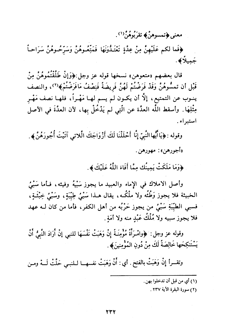 وقوله - عزَّ وجلَّ -: (يَا أَيُّهَا النَّبِيُّ إِنَّا أَحْلَلْنَا لَكَ أَزْوَاجَكَ اللَّاتِي آتَيْتَ أُجُورَهُنَّ وَمَا مَلَكَتْ يَمِينُكَ مِمَّا أَفَاءَ اللَّهُ عَلَيْكَ وَبَنَاتِ عَمِّكَ وَبَنَاتِ عَمَّاتِكَ وَبَنَاتِ خَالِكَ وَبَنَاتِ خَالَاتِكَ اللَّاتِي هَاجَرْنَ مَعَكَ وَامْرَأَةً مُؤْمِنَةً إِنْ وَهَبَتْ نَفْسَهَا لِلنَّبِيِّ إِنْ أَرَادَ النَّبِيُّ أَنْ يَسْتَنْكِحَهَا خَالِصَةً لَكَ مِنْ دُونِ الْمُؤْمِنِينَ قَدْ عَلِمْنَا مَا فَرَضْنَا عَلَيْهِمْ فِي أَزْوَاجِهِمْ وَمَا مَلَكَتْ أَيْمَانُهُمْ لِكَيْلَا يَكُونَ عَلَيْكَ حَرَجٌ وَكَانَ اللَّهُ غَفُورًا رَحِيمًا (50)
