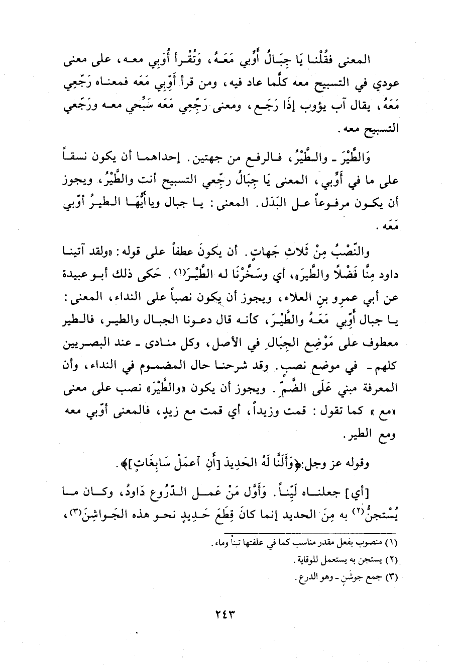 ويجوز أن يكون " والطيْرَ " نصب على معنى " مع " كما تقول: قمت وزيداً، أي قمت مع زيدٍ، فالمعنى (أَوِّبِي مَعَه) ومع الطير (1).