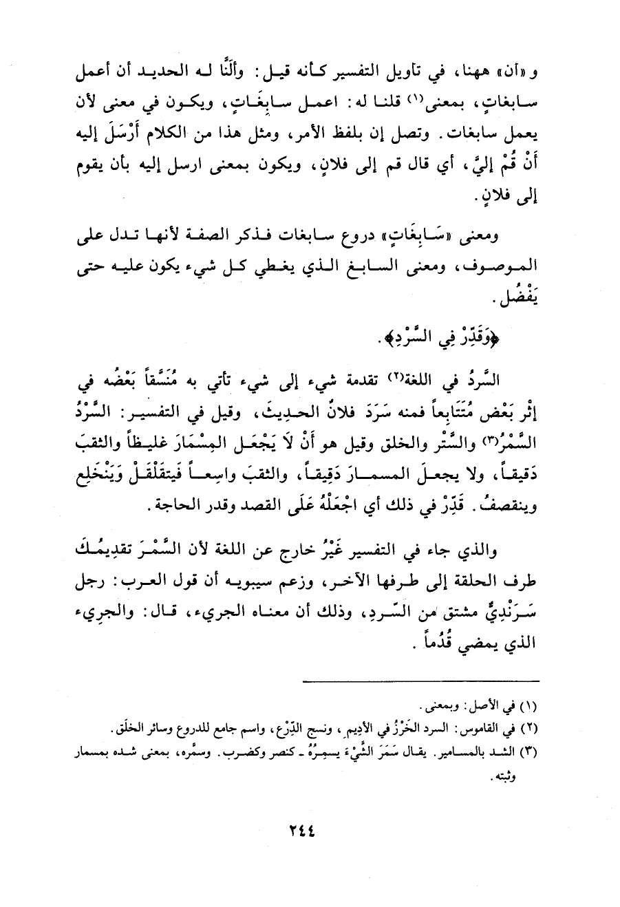 إثْر بَعْض مُتَتَابِعاً فمنه سَرَدَ فلان الحدِيثَ، وقيل في التفسير: السَّرْدُ