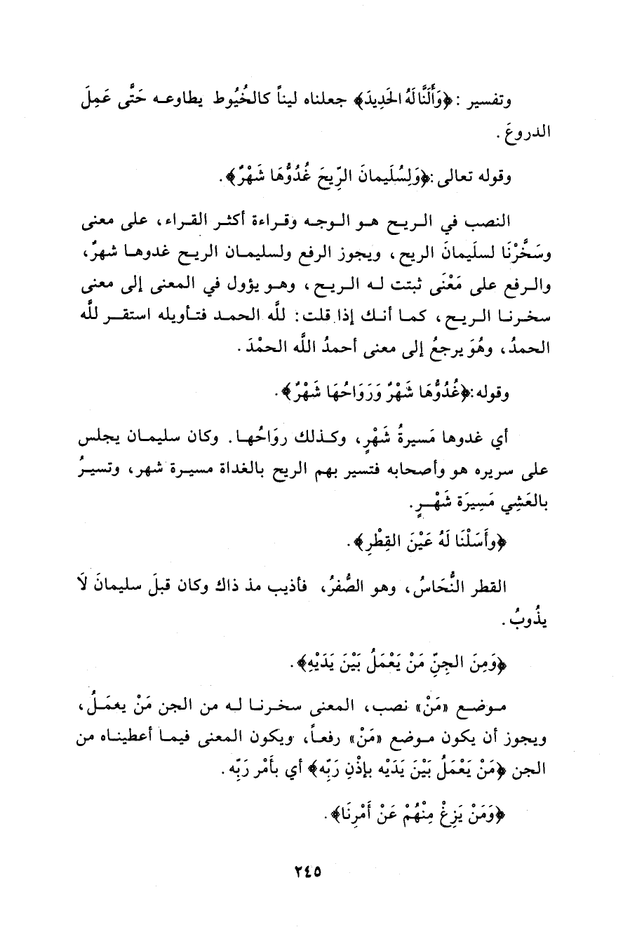 وقوله تعالى: (وَلِسُلَيْمَانَ الرِّيحَ غُدُوُّهَا شَهْرٌ وَرَوَاحُهَا شَهْرٌ وَأَسَلْنَا لَهُ عَيْنَ الْقِطْرِ وَمِنَ الْجِنِّ مَنْ يَعْمَلُ بَيْنَ يَدَيْهِ بِإِذْنِ رَبِّهِ وَمَنْ يَزِغْ مِنْهُمْ عَنْ أَمْرِنَا نُذِقْهُ مِنْ عَذَابِ السَّعِيرِ (12)