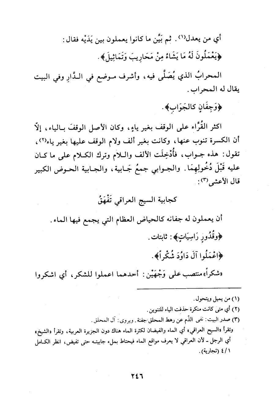 (يَعْمَلُونَ لَهُ مَا يَشَاءُ مِنْ مَحَارِيبَ وَتَمَاثِيلَ وَجِفَانٍ كَالْجَوَابِ وَقُدُورٍ رَاسِيَاتٍ اعْمَلُوا آلَ دَاوُودَ شُكْرًا وَقَلِيلٌ مِنْ عِبَادِيَ الشَّكُورُ (13)