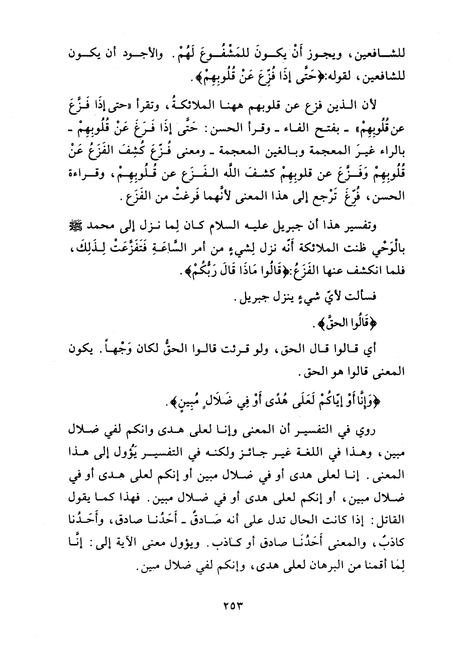 والفَراغُ: الفَناء والمعنى: حتى إذا أَفْنى اللَّهُ الوَجَلَ أو انتفى بنفسِه، أو نُفِي الوَجَلُ والخوفُ عن قلوبهم فلمَّا بُني للمفعولِ قام الجارُّ مَقامَه. وقرأ ابن مسعود وابن عمر «افْرُنْقِعَ» من الافْرِنْقاع. وهو التفرُّقُ. قال الزمخشري: «والكلمةُ مركبةٌ مِنْ حروف المفارقة مع زيادة العين، كما رُكِّب» اقْمَطَرَّ «من حروفِ القَمْطِ مع زيادة الراء». قال الشيخ: «فإنْ عَنَى أنَّ العينَ من حروفِ الزيادة، وكذا الراء، وهو ظاهرُ كلامِه فليس بصحيحٍ؛ لأنَّ العين والراءَ ليسا مِنْ حروف الزيادةِ. وإنْ عنى أنَّ الكلمة فيها حروفُ ما ذُكِر، وزائداً إلى ذلك العينُ والراءُ، والمادةُ فَرْقَعَ وقَمْطَر فهو صحيحٌ» انتهى. وهذه قراءةٌ مخالِفَةٌ للسَّواد، ومع ذلك هي لفظةٌ غريبةٌ ثقيلةُ اللفظِ، نَصَّ أهلُ البيانِ عليها وَمثَّلوا بها. وحَكَوْا عن عيسى بنِ عمر أنه غُشِيَ عليه ذاتَ يومٍ فاجتمع عليه النَّظَّارَةُ فلمَّا أفاق قال: «أراكم تَكَأْكَأْتُمْ عليَّ تَكَأْكُؤَكم على ذي جِنَّةٍ افرَنْقِعوا عني» أي: اجتمعتُمْ عليَّ اجتماعَكم على المجنونِ تَفَرَّقوا عني، فعابَها الناسُ عليه، حيث استعمل مثلَ هذه الألفاظِ الثقيلةِ المستغربةِ.