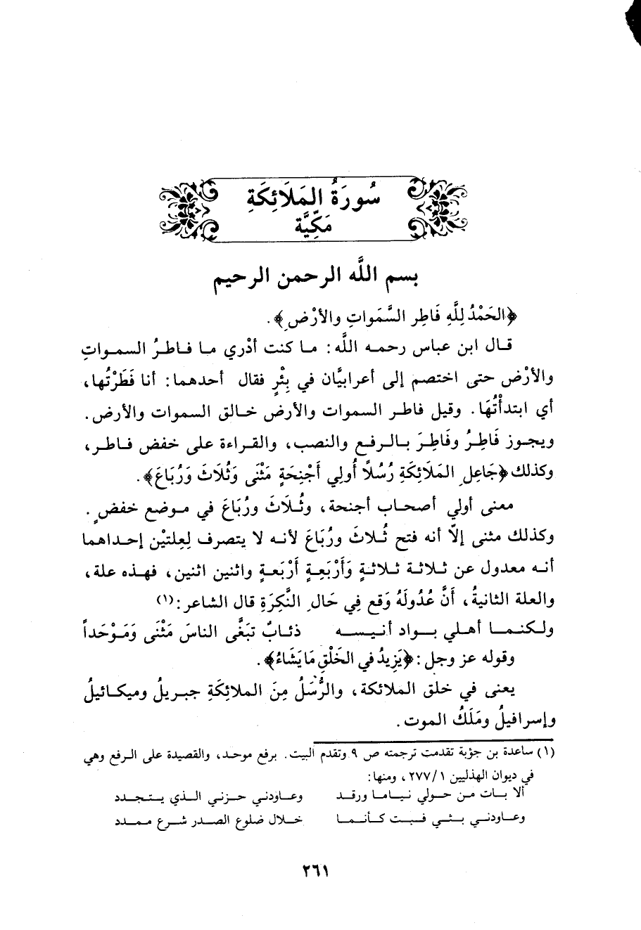 (الْحَمْدُ لِلَّهِ فَاطِرِ السَّمَاوَاتِ وَالْأَرْضِ جَاعِلِ الْمَلَائِكَةِ رُسُلًا أُولِي أَجْنِحَةٍ مَثْنَى وَثُلَاثَ وَرُبَاعَ يَزِيدُ فِي الْخَلْقِ مَا يَشَاءُ إِنَّ اللَّهَ عَلَى كُلِّ شَيْءٍ قَدِيرٌ (1)
