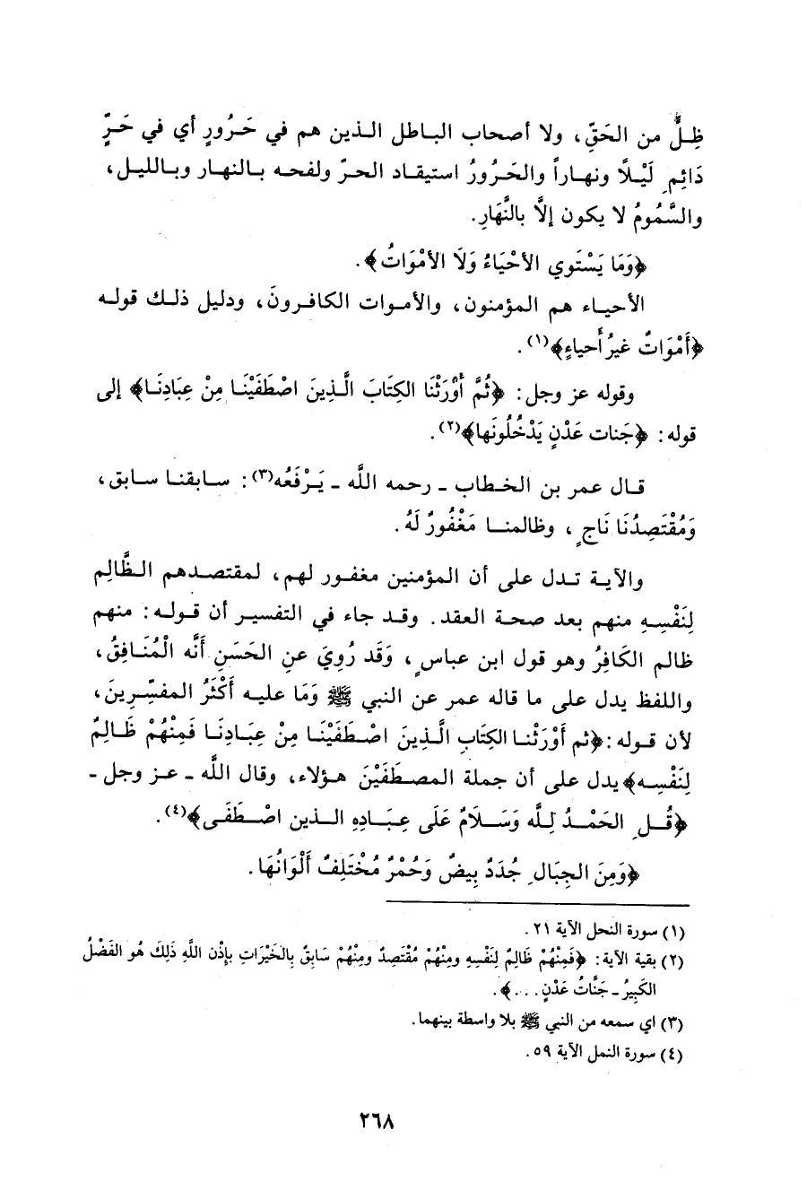 واللفظ يدل على ما قاله عمر عن النبي - صلى الله عليه وسلم - وَمَا عليه أَكْثَرُ المفسرِينَ، لأن قوله: (ثُمَّ أَوْرَثْنَا الْكِتَابَ الَّذِينَ اصْطَفَيْنَا مِنْ عِبَادِنَا فَمِنْهُمْ ظَالِمٌ لِنَفْسِهِ) يدل على أن جملة المصطَفَيْنَ هؤلاء.