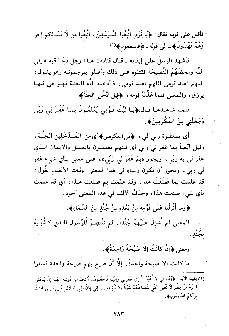 فأقبل على قومه فقال: (يَا قَوْمِ اتَّبِعُوا الْمُرْسَلِينَ (20) اتَّبِعُوا مَنْ لَا يَسْأَلُكُمْ أَجْرًا وَهُمْ مُهْتَدُونَ (21) - إلى قوله - (فَاسْمَعُونِ).