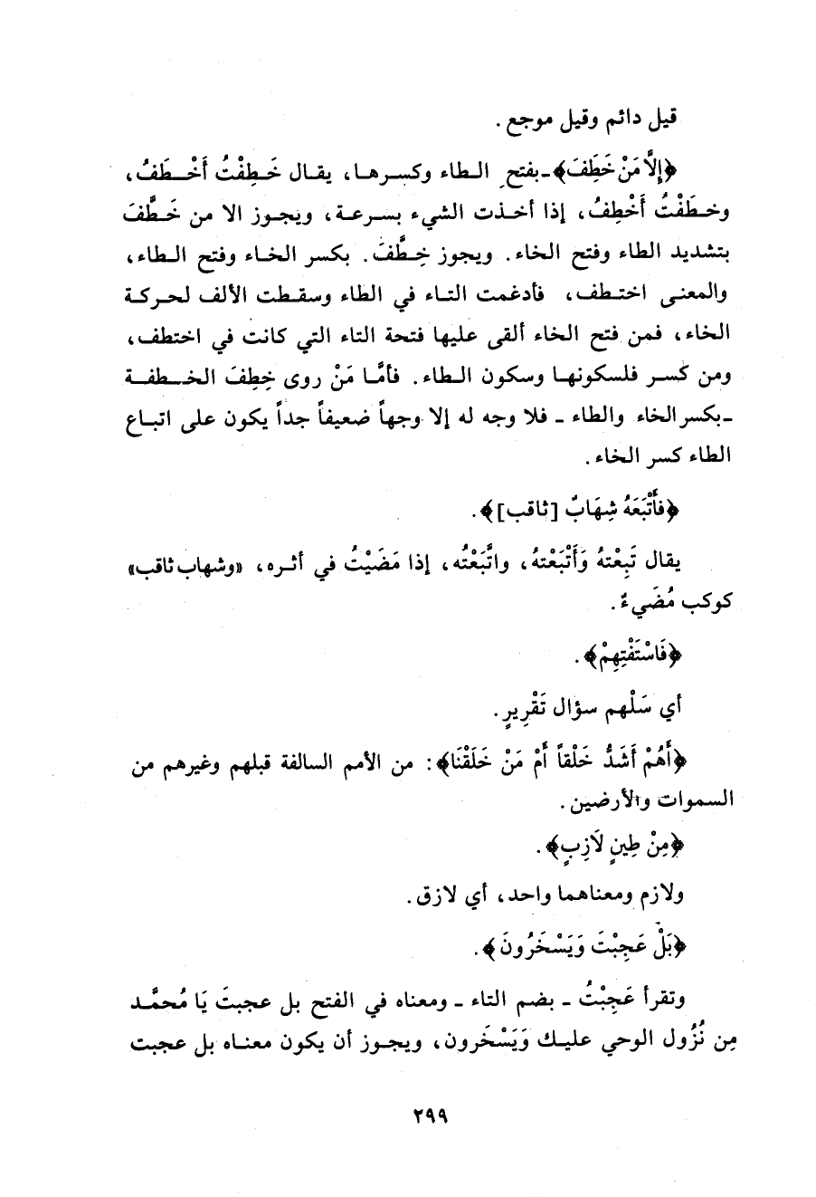 قوله: {إِلاَّ مَنْ خَطِفَ}: فيه وجهان، أحدُهما: أنه مرفوعُ/ المحلِّ بدلاً مِنْ ضميرِ «لا يَسَّمَّعون» وهو أحسنُ؛ لأنه غيرُ موجَب. والثاني: أنه منصوبٌ على أصلِ الاستثناء. والمعنى: أنَّ الشياطينَ لا يَسمعون الملائكةَ إلاَّ مَنْ خَطِف. قلت: ويجوز أَنْ تكون «مَنْ» شرطيةً، وجوابُها «فَأَتْبَعَه»، أو موصولةً وخبرُها «فَأَتْبَعَه» وهو استثناءٌ منقطعٌ. وقد نَصُّوا على أنَّ مثلَ هذه الجملةِ تكونُ استثناءً منقطعاً كقوله: {لَّسْتَ عَلَيْهِم بِمُصَيْطِرٍ * إِلاَّ مَن تولى وَكَفَرَ} [الغاشية: 22 - 23]. والخَطْفَةُ مصدرٌ معرفٌ بأل الجنسية أو العهدية.
