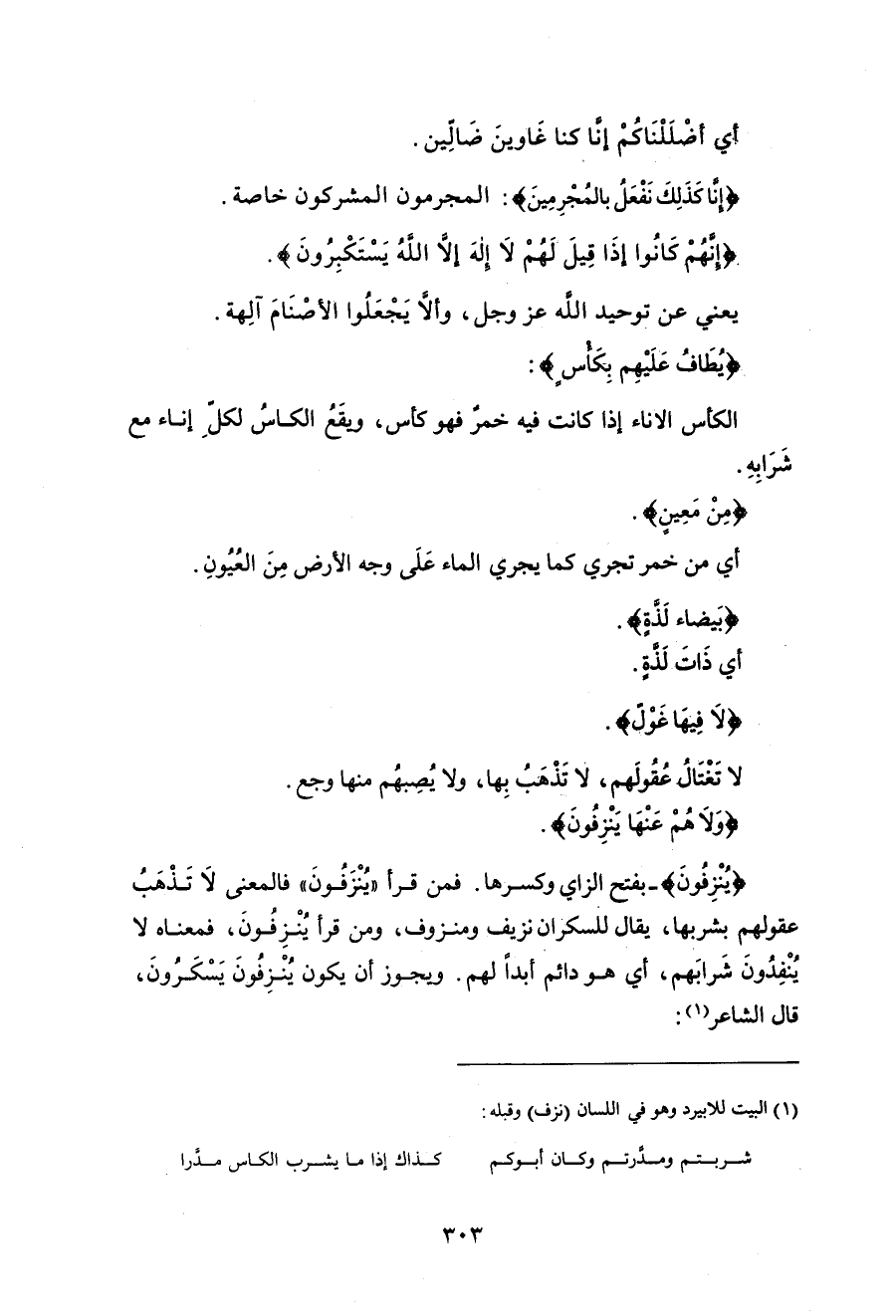 فمن قرأ " يُنْزَفُونَ " فالمعنى لَا تَذْهَبُ عقولهم بشربها، يقال للسكران نزيف ومنزوف.