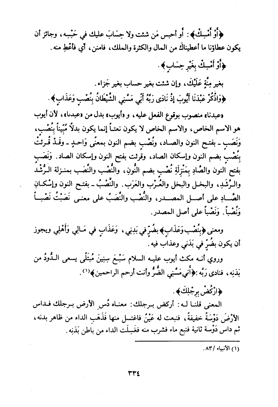 ومعنى (بِنُصْب وَعَذَابٍ) بضُرٍّ في بَدِنِي، وَعَذَابٍ في مَالِي وَأَهْلِي