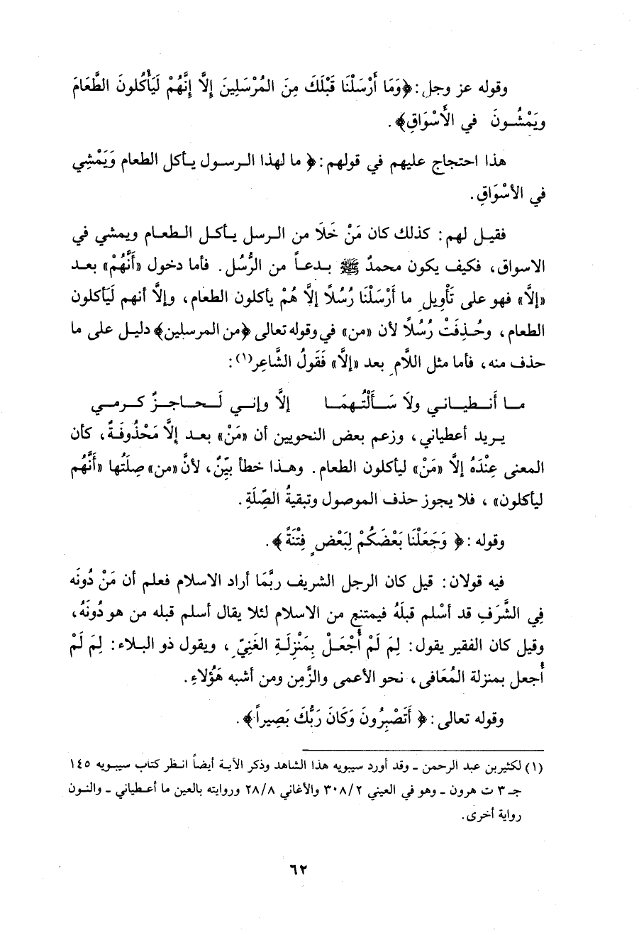 وقوله عزَّ وجلَّ: (وَمَا أَرْسَلْنَا قَبْلَكَ مِنَ الْمُرْسَلِينَ إِلَّا إِنَّهُمْ لَيَأْكُلُونَ الطَّعَامَ وَيَمْشُونَ فِي الْأَسْوَاقِ وَجَعَلْنَا بَعْضَكُمْ لِبَعْضٍ فِتْنَةً أَتَصْبِرُونَ وَكَانَ رَبُّكَ بَصِيرًا (20)