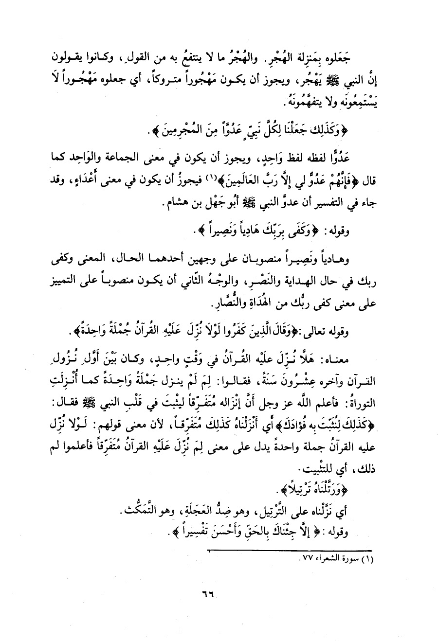 وقوله تعالى: (وَقَالَ الَّذِينَ كَفَرُوا لَوْلَا نُزِّلَ عَلَيْهِ الْقُرْآنُ جُمْلَةً وَاحِدَةً كَذَلِكَ لِنُثَبِّتَ بِهِ فُؤَادَكَ وَرَتَّلْنَاهُ تَرْتِيلًا (32)