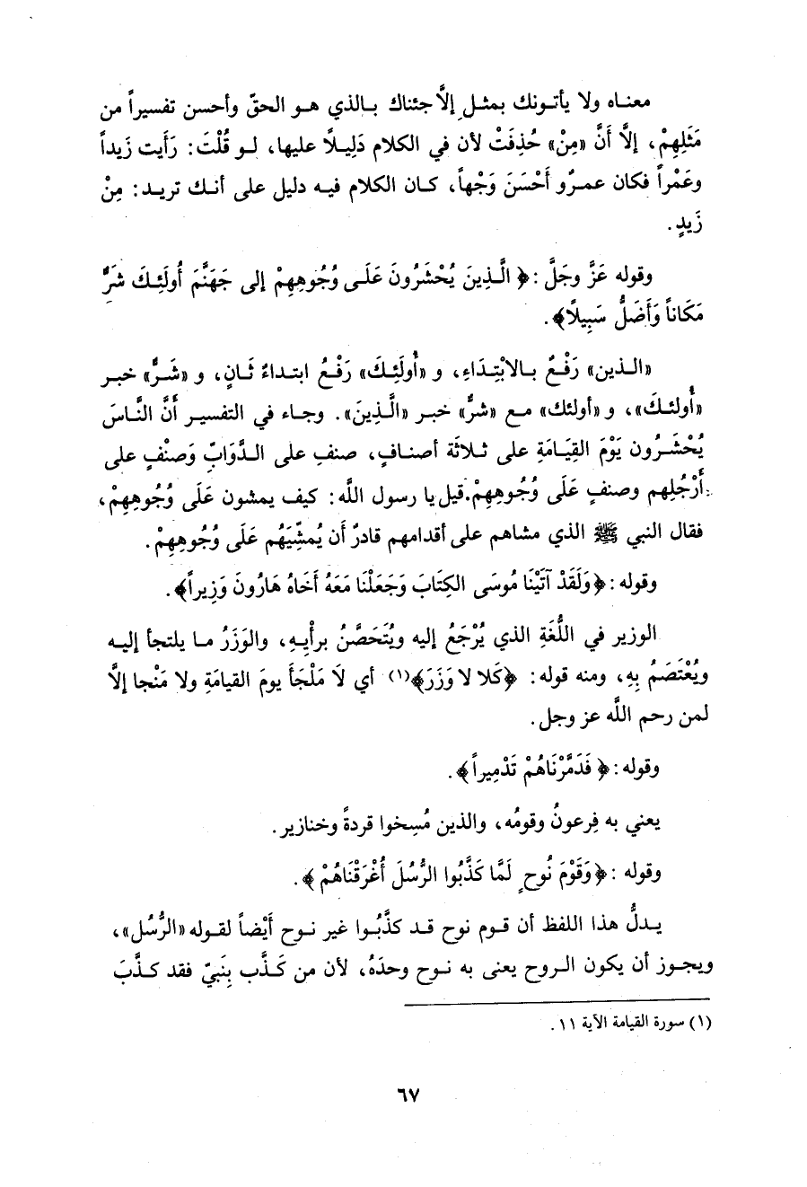 وقوله عَزَ وجَل: (الَّذِينَ يُحْشَرُونَ عَلَى وُجُوهِهِمْ إِلَى جَهَنَّمَ أُولَئِكَ شَرٌّ مَكَانًا وَأَضَلُّ سَبِيلًا (34)