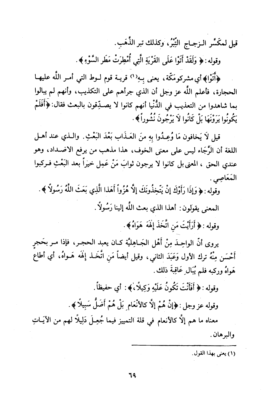 وقوله: (وَلَقَدْ أَتَوْا عَلَى الْقَرْيَةِ الَّتِي أُمْطِرَتْ مَطَرَ السَّوْءِ أَفَلَمْ يَكُونُوا يَرَوْنَهَا بَلْ كَانُوا لَا يَرْجُونَ نُشُورًا (40)