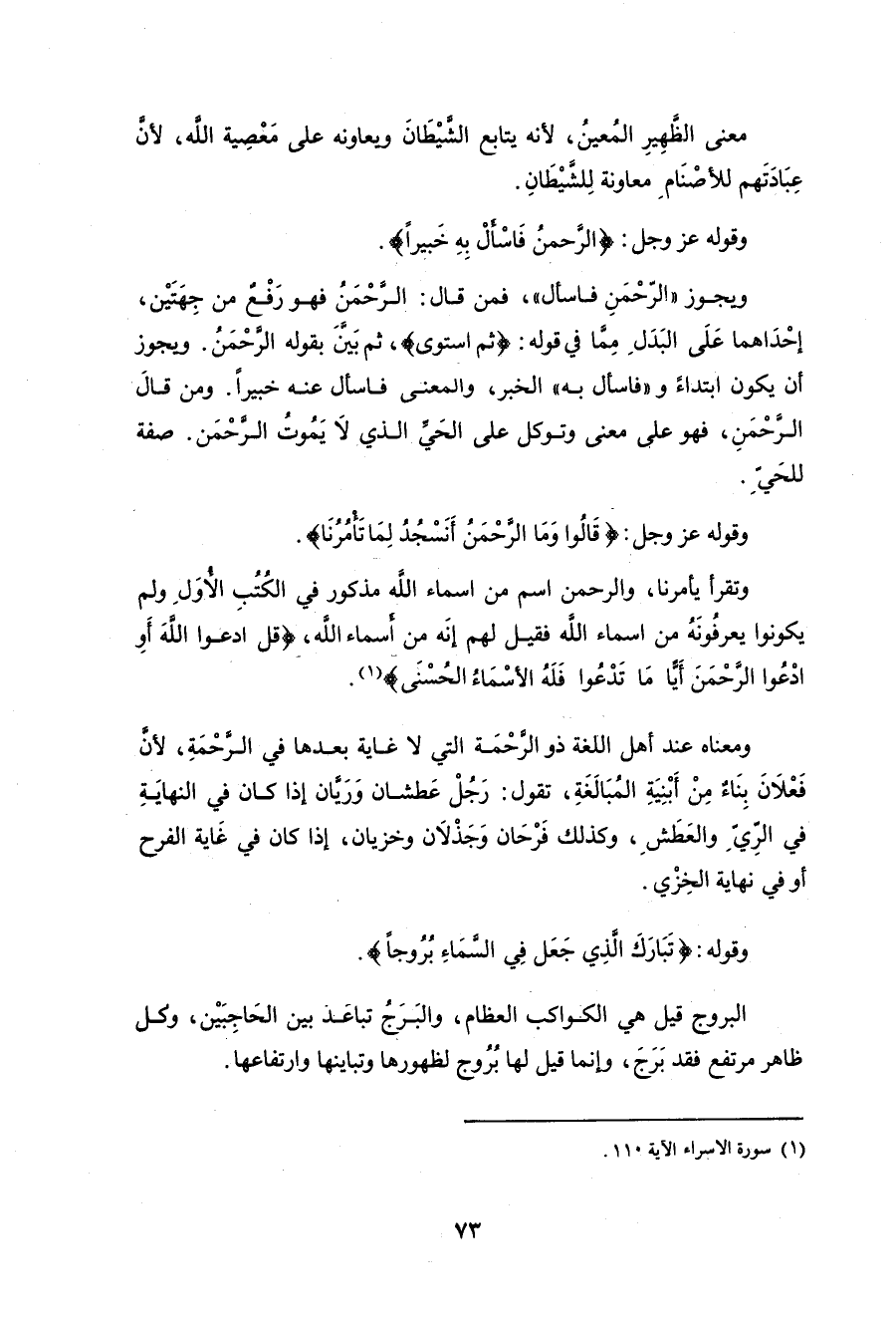 ومن قالَ " الرحْمَنِ " فهو على معنى: وَتَوَكَّلْ عَلَى الْحَيِّ الَّذِي لَا يَمُوتُ (الرحْمَنِ). صفة للْحَيِّ.