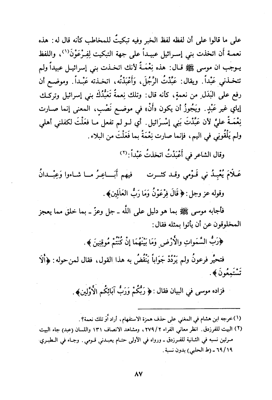 يوجب أن موسى - صلى الله عليه وسلم - قال: هذه نِعْمَة لأنك اتخذت بني إسرائيل عبيداً ولم تتخذني عَبْداً.