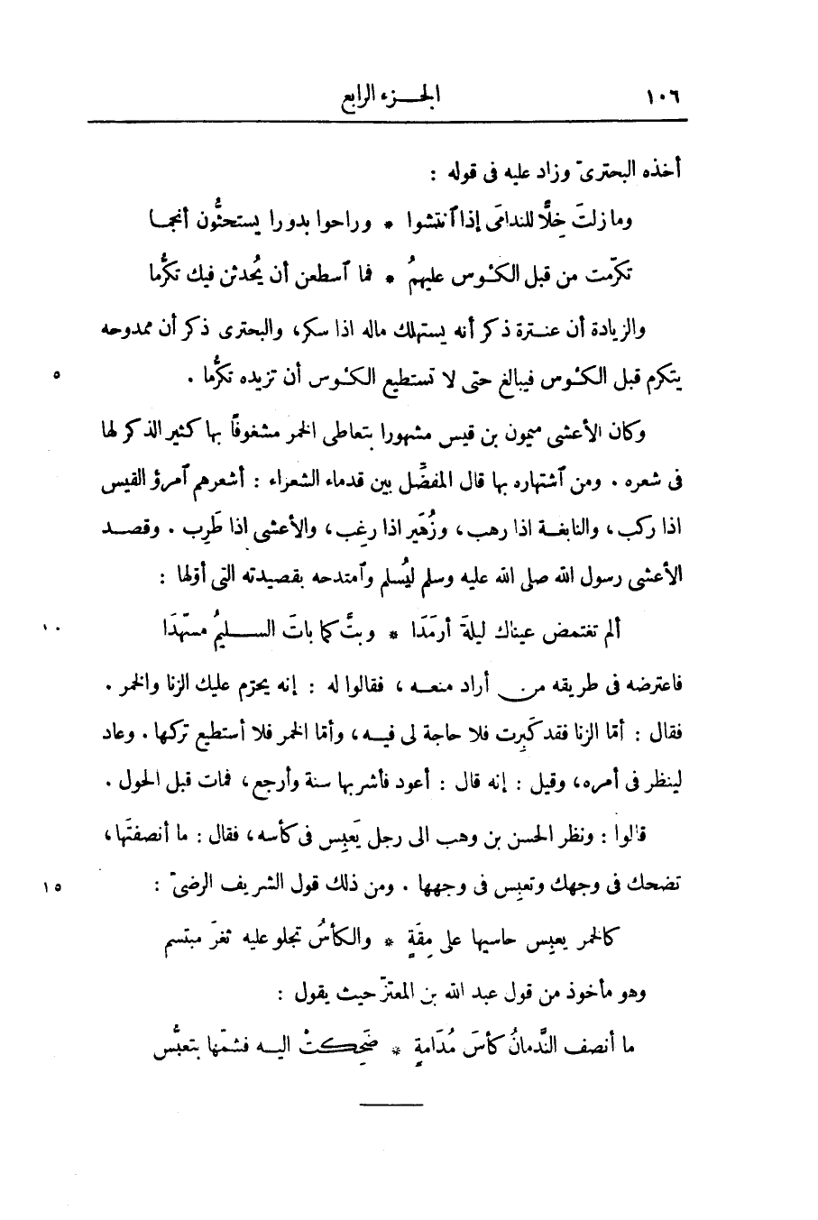 والزيادة أن عنترة ذكر أنه يستهلك ماله اذا سكر، والبحترى ذكر أن ممدوحه يتكرم قبل الكؤس فيبالغ حتى لا تستطيع الكؤس أن تزيده تكرّما.