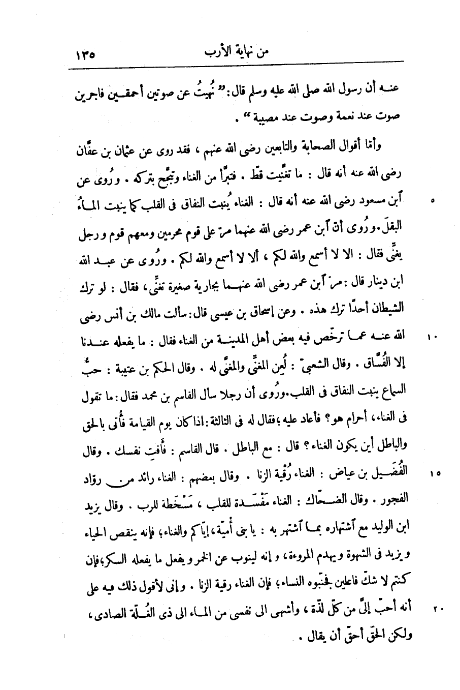 فقد روى عن عثمان بن عفّان رضى الله عنه أنه قال: ما تغنّيت قطّ. فتبرّأ من الغناء وتبحّح بتركه. وروى عن ابن مسعود رضى الله عنه أنه قال: الغناء ينبت النفاق في القلب كما ينبت الماء البقل. وروى أنّ ابن عمر رضى الله عنهما مرّ على قوم محرمين ومعهم قوم ورجل يغنّى فقال: الا لا أسمع والله لكم، ألا لا أسمع والله لكم. وروى عن عبد الله ابن دينار قال: مرّ ابن عمر رضى الله عنهما بجارية صغيرة تغنّى، فقال: لو ترك الشيطان أحدا ترك هذه. وعن إسحاق بن عيسى قال: سألت مالك بن أنس رضى الله عنه عما ترخّص فيه بعض أهل المدينة من الغناء فقال: ما يفعله عندنا إلا الفسّاق. وقال الشعبىّ: لعن المغنّى والمغنّى له. وقال الحكم بن عتيبة: حبّ السماع ينبت النفاق في القلب. وروى أن رجلا سأل القاسم بن محمد فقال: ما تقول فى الغناء، أحرام هو؟ فأعاد عليه؛ فقال له في الثالثة: اذا كان يوم القيامة فأتى بالحق والباطل أين يكون الغناء؟ قال: مع الباطل. قال القاسم: فأفت نفسك. وقال الفضيل بن عياض: الغناء رقية الزنا. وقال بعضهم: الغناء رائد من روّاد الفجور. وقال الضحّاك: الغناء مفسدة للقلب، مسخطة للرب. وقال يزيد ابن الوليد مع اشتهاره بما اشتهر به: يا بنى أميّة، إيّاكم والغناء؛ فإنه ينقص الحياء ويزيد في الشهوة ويهدم المروءة، وإنه لينوب عن الخمر ويفعل ما يفعله السكر؛ فإن كنتم لا شكّ فاعلين فجنّبوه النساء؛ فإن الغناء رقية الزنا. وإنى لأقول ذلك فيه على أنه أحبّ إلىّ من كلّ لذّة، وأشهى الى نفسى من الماء الى ذى الغلّة الصادى، ولكن الحقّ أحقّ أن يقال.