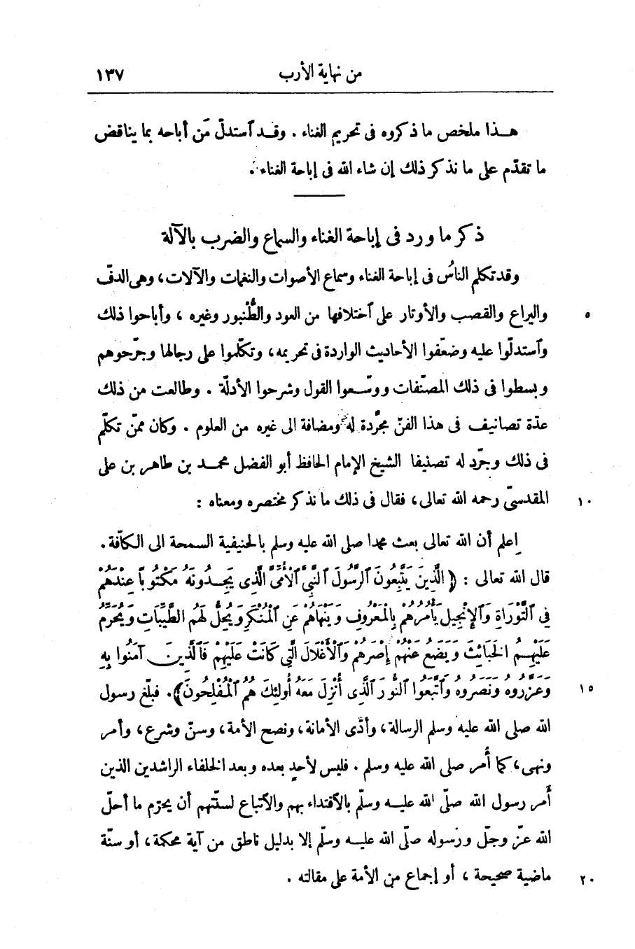 وقد تكلم الناس في إباحة الغناء وسماع الأصوات والنغمات والآلات، وهى الدفّ واليراع والقصب والأوتار على اختلافها من العود والطّنبور وغيره، وأباحوا ذلك واستدلّوا عليه وضعفّوا الأحاديث الواردة في تحريمه، وتكلّموا على رجالها وجرّحوهم وبسطوا في ذلك المصنّفات ووسّعوا القول وشرحوا الأدلّة. وطالعت من ذلك عدّة تصانيف في هذا الفنّ مجرّدة له ومضافة الى غيره من العلوم. وكان ممّن تكلّم فى ذلك وجرّد له تصنيفا الشيخ الإمام الحافظ أبو الفضل محمد بن طاهر بن على المقدّسى رحمه الله تعالى، فقال في ذلك ما نذكر مختصره ومعناه: