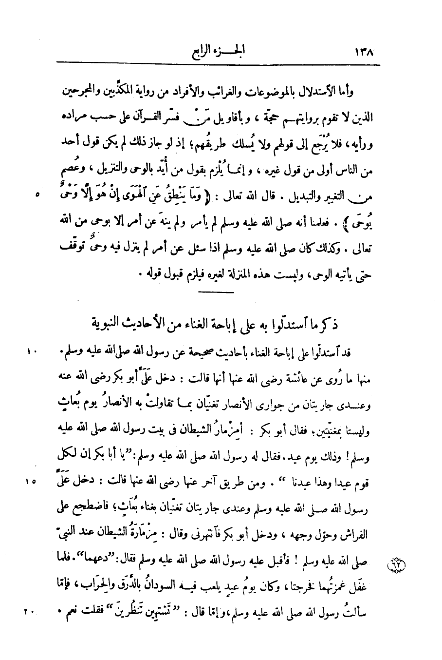 منها ما روى عن عائشة رضى الله عنها أنها قالت: دخل علىّ أبو بكر رضى الله عنه وعندى جاريتان من جوارى الأنصار تغنّيان بما تقاولت به الأنصار يوم بعاث وليستا بمغنّيتين؛ فقال أبو بكر: أمزمار الشيطان في بيت رسول الله صلّى الله عليه وسلّم! وذلك يوم عيد. فقال له رسول الله صلّى الله عليه وسلّم: «يا أبا بكر إن لكل قوم عيدا وهذا عيدنا» . ومن طريق آخر عنها رضى الله عنها قالت: دخل علىّ رسول الله صلّى الله عليه وسلّم وعندى جاريتان تغنّيان بغناء بعاث؛ فاضطجع على الفراش وحوّل وجهه، ودخل أبو بكر فانتهزنى وقال: مزمارة الشيطان عند النبىّ صلى الله عليه وسلم! فأقبل عليه رسول الله صلّى الله عليه وسلّم فقال: «دعهما» . فلما غفل غمزتهما فخرجتا، وكان يوم عيد يلعب فيه السودان بالدّرق والحراب، فإمّا سألت رسول الله صلّى الله عليه وسلّم، وإمّا قال: «تشتهين تنظرين» فقلت نعم.