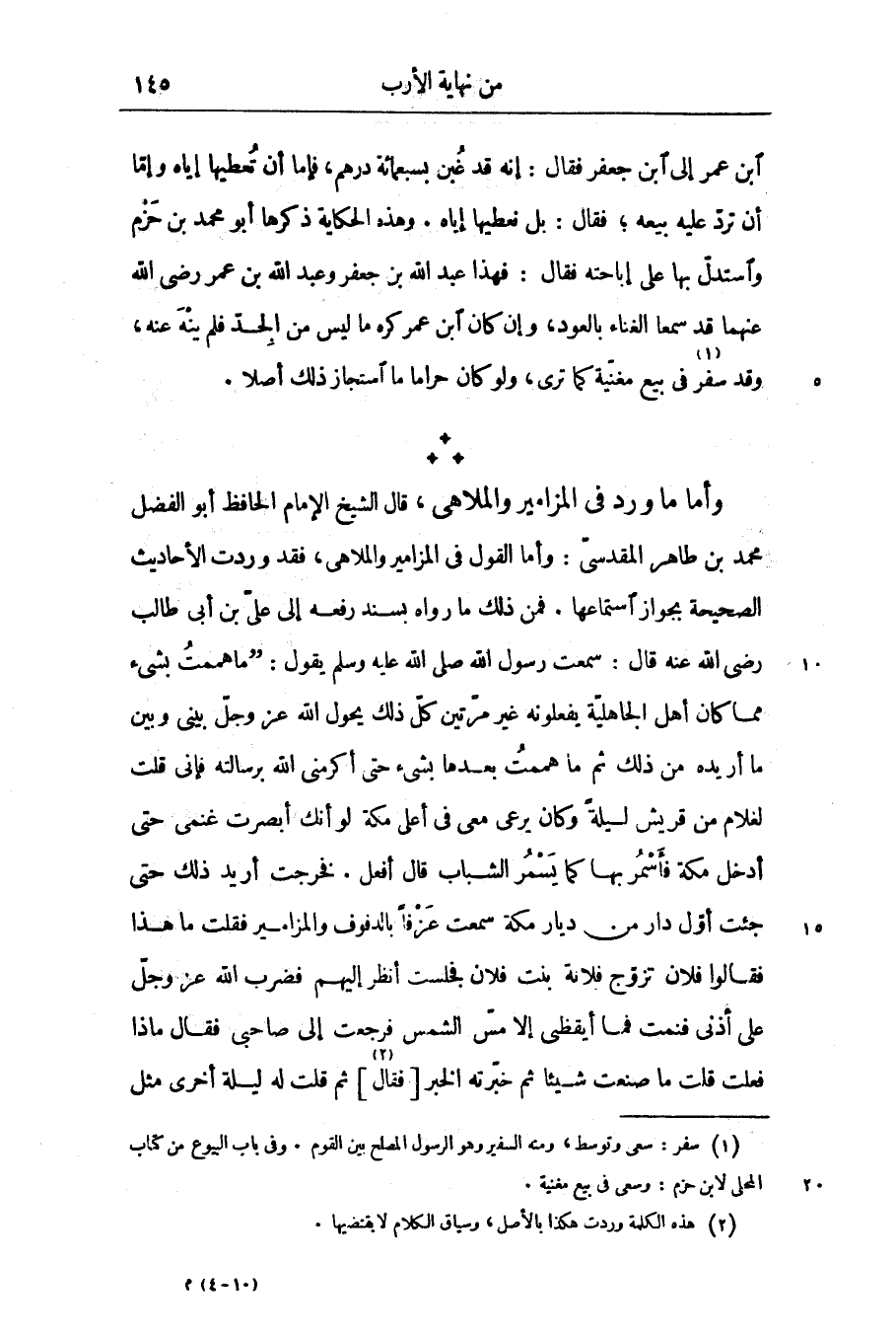 قال الشيخ الإمام الحافظ أبو الفضل محمد بن طاهر المقدسىّ: وأما القول في المزامير والملاهى، فقد وردت الأحاديث الصحيحة بجواز استماعها. فمن ذلك ما رواه بسند رفعه إلى علىّ بن أبى طالب رضى الله عنه قال: سمعت رسول الله صلّى الله عليه وسلم يقول: «ما هممت بشىء مما كان أهل الجاهليّة يفعلونه غير مرّتين كلّ ذلك يحول الله عزّ وجلّ بينى وبين ما أريده من ذلك ثم ما هممت بعدها بشىء حتى أكرمنى الله برسالته فإنى قلت لغلام من قريش ليلة وكان يرعى معى في أعلى مكة لو أنك أبصرت غنمى حتى أدخل مكة فأسمر بها كما يسمر الشباب قال أفعل. فخرجت أريد ذلك حتى جئت أوّل دار من ديار مكة سمعت عزفا بالدفوف والمزامير فقلت ما هذا فقالوا فلان تزوّج فلانة بنت فلان فجلست أنظر إليهم فضرب الله عزّ وجلّ على أذنى فنمت فما أيقظى إلا مسّ الشمس فرجعت إلى صاحبى فقال ماذا فعلت قلت ما صنعت شيئا ثم خبّرته الخبر [فقال «2» ] ثم قلت له ليلة أخرى مثل
