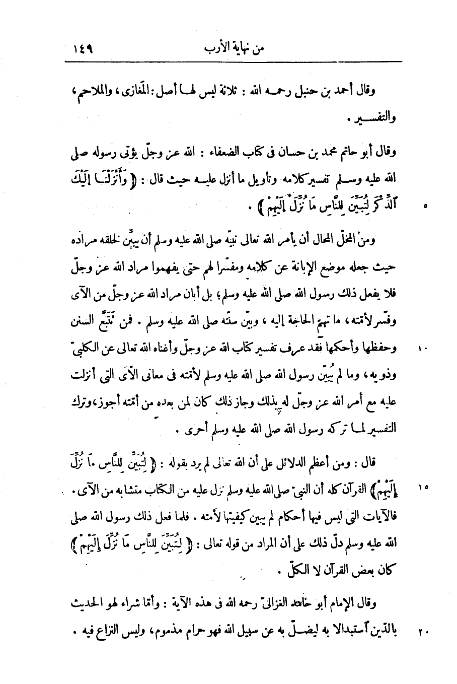 ومن المخلّ المحال أن يأمر الله تعالى نبيّه صلّى الله عليه وسلم أن يبيّن لخلقه مراده حيث جعله موضع الإبانة عن كلامه ومفسّرا لهم حتى يفهموا مراد الله عز وجلّ فلا يفعل ذلك رسول الله صلّى الله عليه وسلم؛ بل أبان مراد الله عز وجلّ من الآى وفسّر لأمّته، ما تهمّ الحاجة إليه، وبيّن سنّته صلّى الله عليه وسلم. فمن تتبّع السنن وحفظها وأحكمها فقد عرف تفسير كتاب الله عز وجلّ وأغناه الله تعالى عن الكلبىّ وذويه، وما لم يبيّن رسول الله صلّى الله عليه وسلم لأمّته في معانى الأى التى أنزلت عليه مع أمر الله عز وجلّ له بذلك وجاز ذلك كان لمن بعده من أمّته أجوز، وترك التفسير لما تركه رسول الله صلّى الله عليه وسلم أحرى.