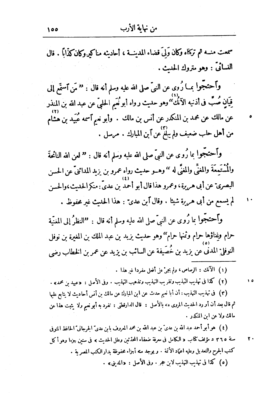 واحتجّوا بما روى عن النبىّ صلّى الله عليه وسلم أنه قال: «من استمع إلى قيان صبّ في أذنيه الآنك «1» » وهو حديث رواه أبو نعيم الحلبىّ عن عبد الله بن المنذر عن مالك عن محمد بن المنكدر عن أنس بن مالك. وأبو نعيم اسمه عبيد بن هشام «2» من أهل حلب ضعيف ولم يبلغ «3» عن ابن المبارك. مرسل.