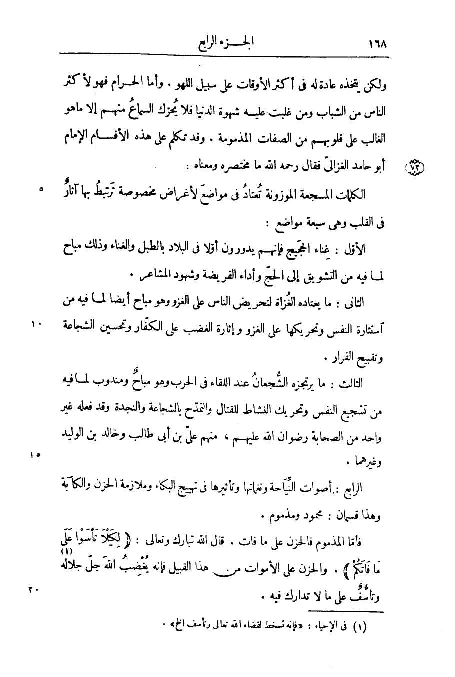 ولكن يتخذه عادة له في أكثر الأوقات على سبيل اللهو. وأما الحرام فهو لأكثر الناس من الشباب ومن غلبت عليه شهوة الدنيا فلا يحرّك السماع منهم إلا ما هو الغالب على قلوبهم من الصفات المذمومة. وقد تكلم على هذه الأقسام الإمام أبو حامد الغزالىّ فقال رحمه الله ما مختصره ومعناه: