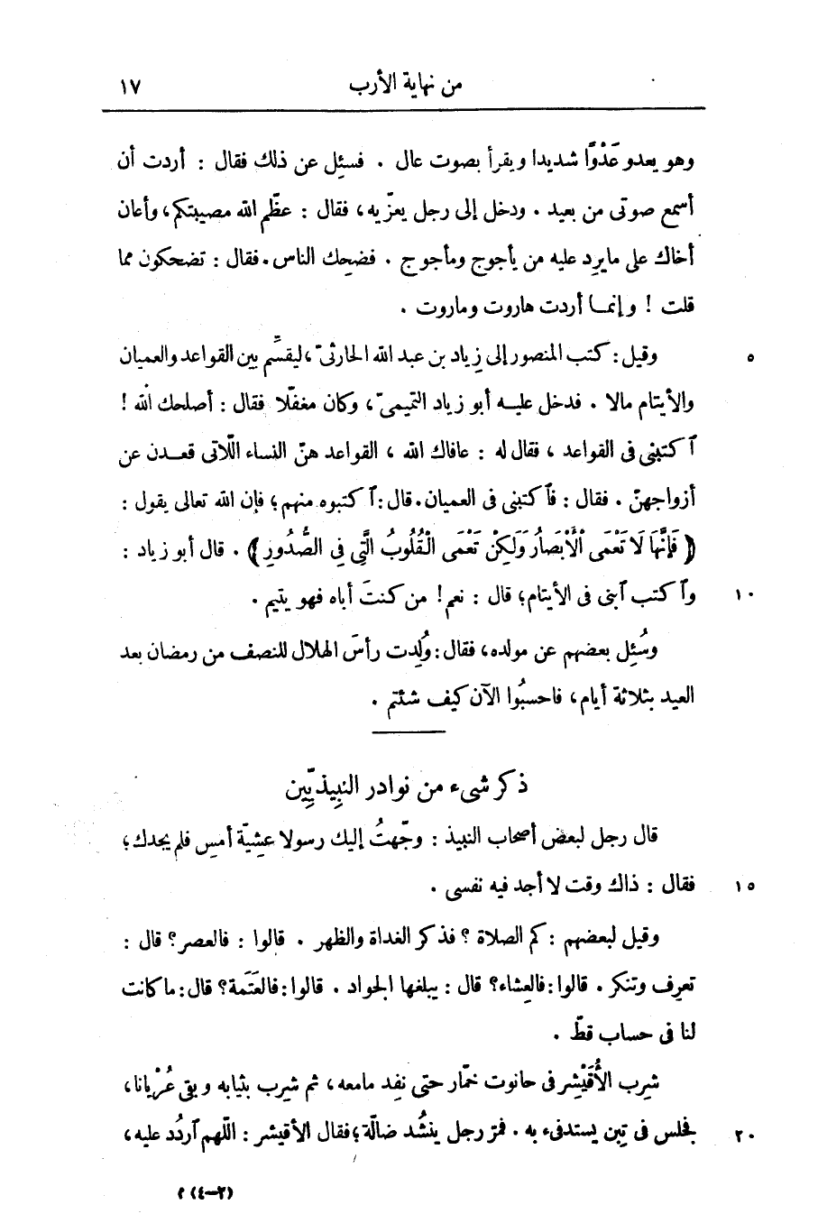 وقيل: كتب المنصور إلى زياد بن عبد الله الحارثىّ، ليقسّم بين القواعد والعميان والأيتام مالا. فدخل عليه أبو زياد التميمىّ، وكان مغفّلا فقال: أصلحك الله! اكتبنى في القواعد، فقال له: عافاك الله، القواعد هنّ النساء اللّاتى قعدن عن أزواجهنّ. فقال: فاكتبنى في العميان. قال: اكتبوه منهم؛ فإن الله تعالى يقول: