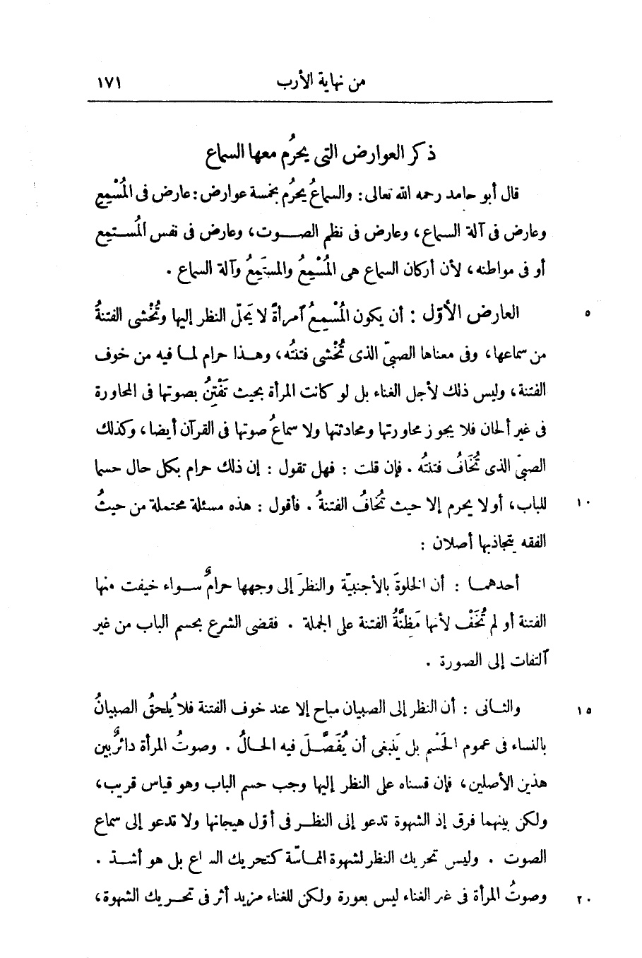 وفي معناها الصبىّ الذى تخشى فتنته، وهذا حرام لما فيه من خوف الفتنة، وليس ذلك لأجل الغناء بل لو كانت المرأة بحيث تفتن بصوتها في المحاورة فى غير ألحان فلا يجوز محاورتها ومحادثتها ولا سماع صوتها في القرآن أيضا، وكذلك الصبى الذى تخاف فتنته. فإن قلت: فهل تقول: إن ذلك حرام بكل حال حسما للباب، أو لا يحرم إلا حيث تخاف الفتنة. فأقول: هذه مسئلة محتملة من حيث الفقه يتجاذبها أصلان: