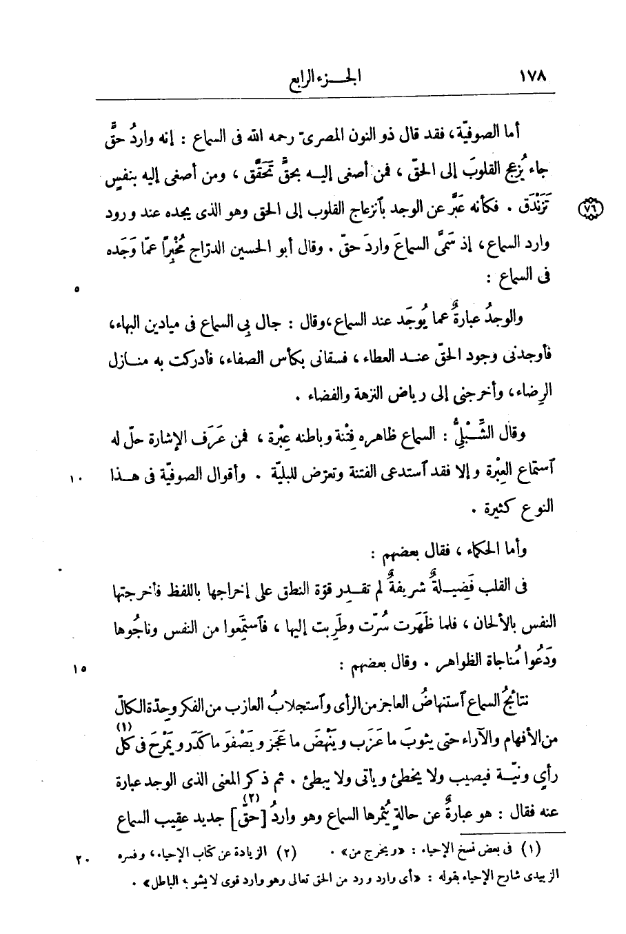 وقال الشّبلىّ: السماع ظاهره فتنة وباطنه عبرة، فمن عرف الإشارة حلّ له استماع العبرة وإلا فقد استدعى الفتنة وتعرّض للبليّة. وأقوال الصوفيّة في هذا النوع كثيرة.