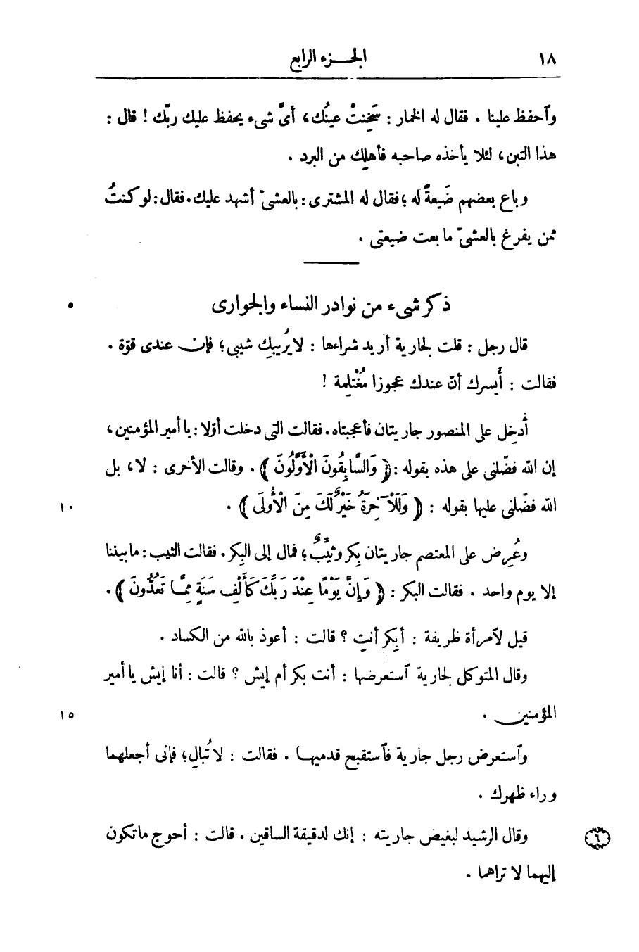 وعرض على المعتصم جاريتان بكر وثيّب؛ فمال إلى البكر. فقالت الثيب: ما بيننا إلا يوم واحد. فقالت البكر: (وَإِنَّ يَوْماً عِنْدَ رَبِّكَ كَأَلْفِ سَنَةٍ مِمَّا تَعُدُّونَ) .